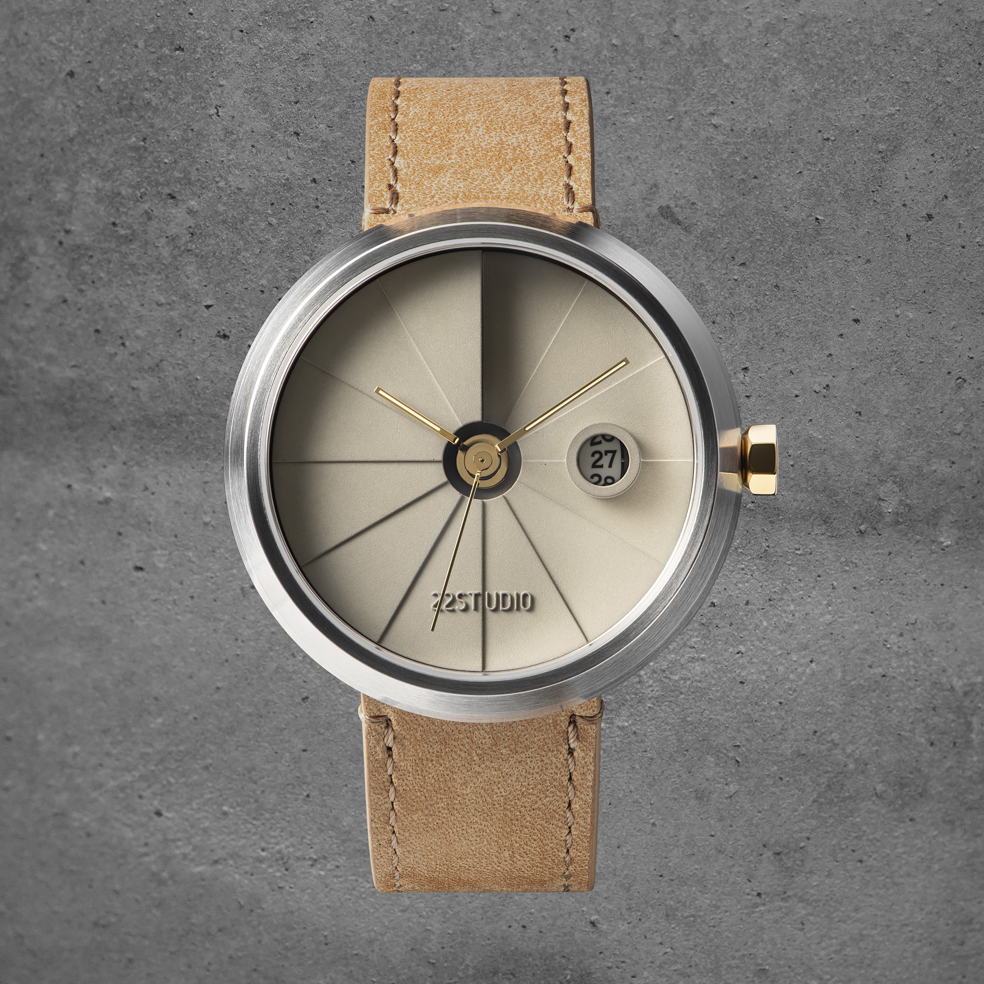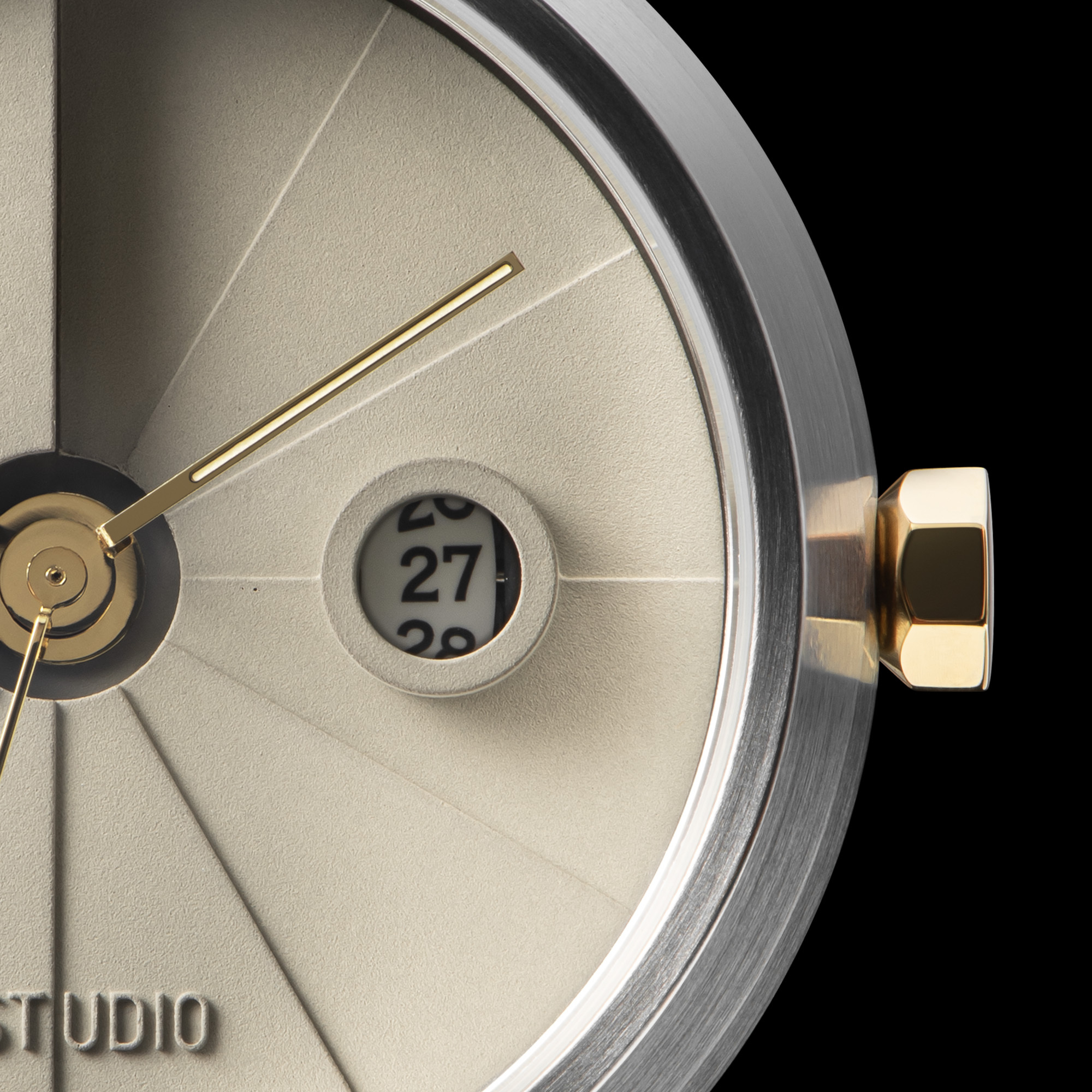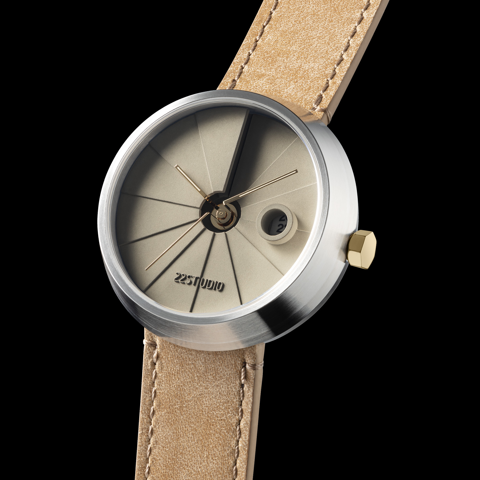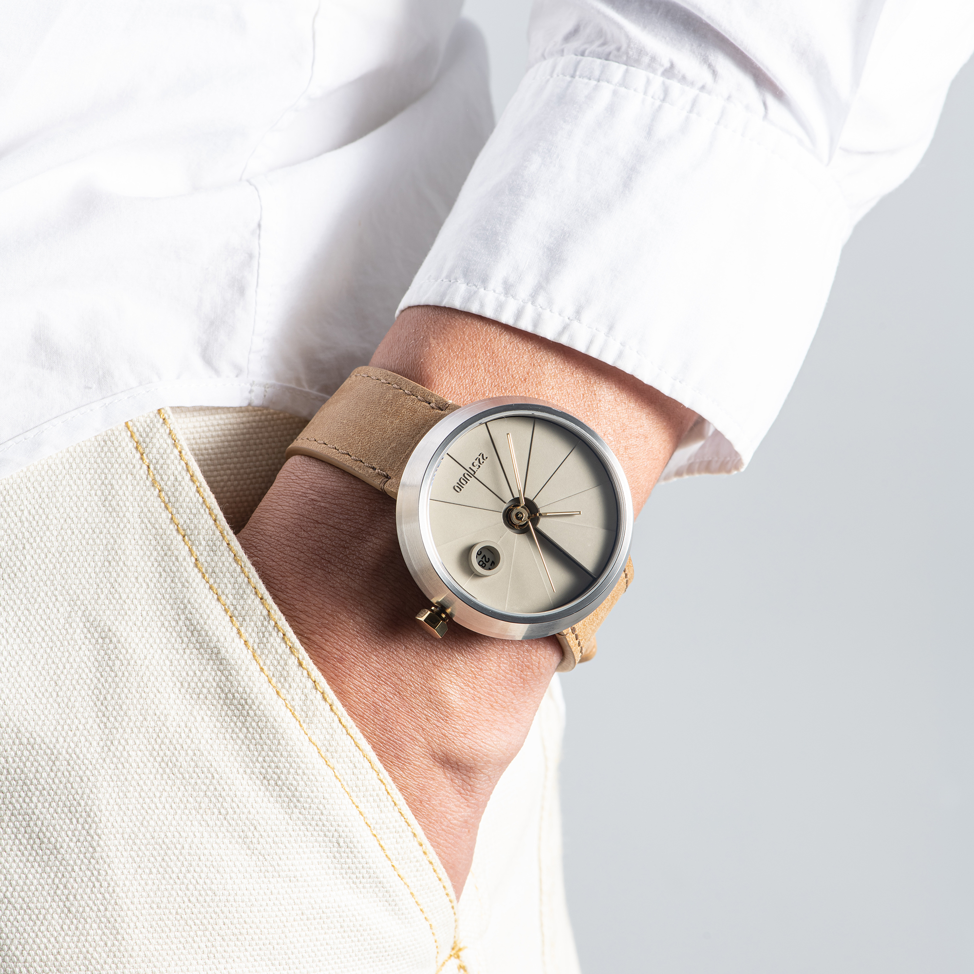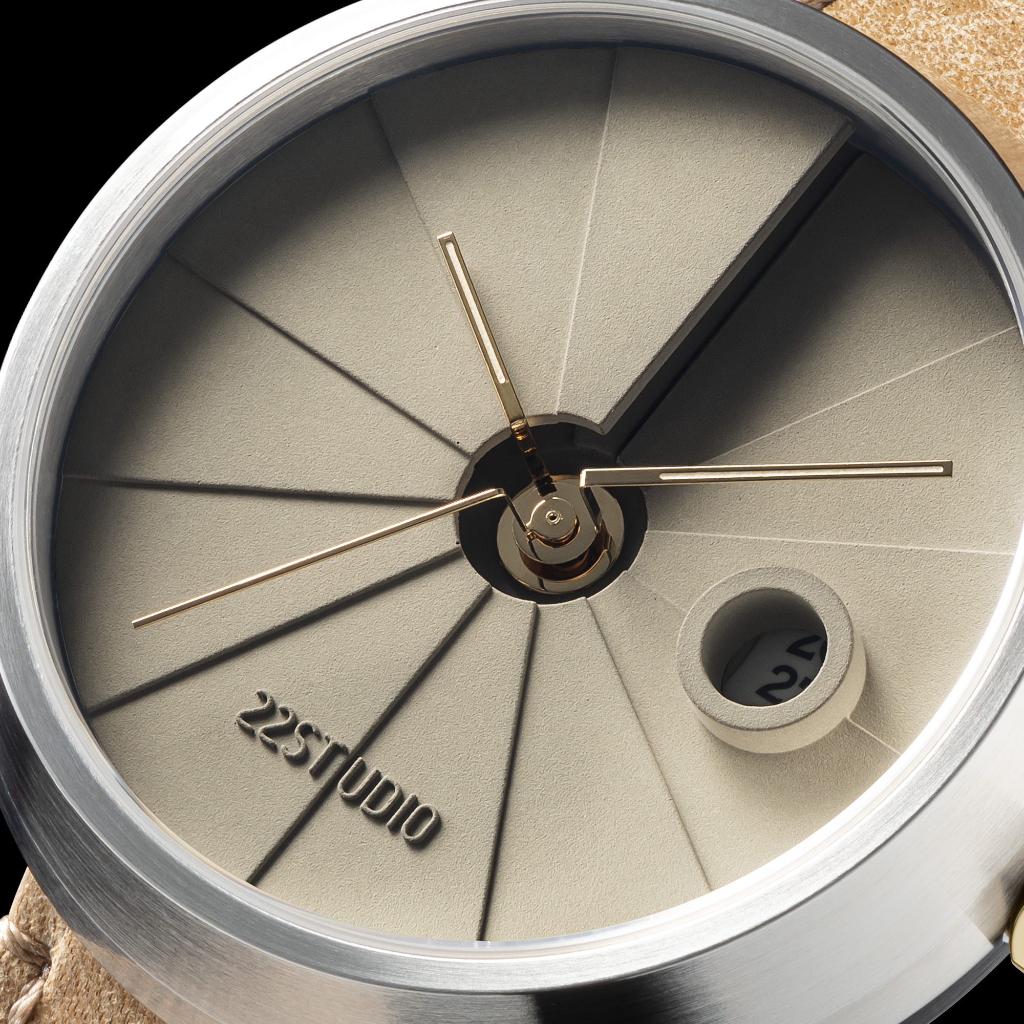 沙色水泥錶盤、亮金色時分針、不銹鋼錶殼、駝色義大利植鞣皮革。令人聯想到穿著亞麻服飾的紳士,縱使炎炎夏日,他依舊一派清爽瀟灑。