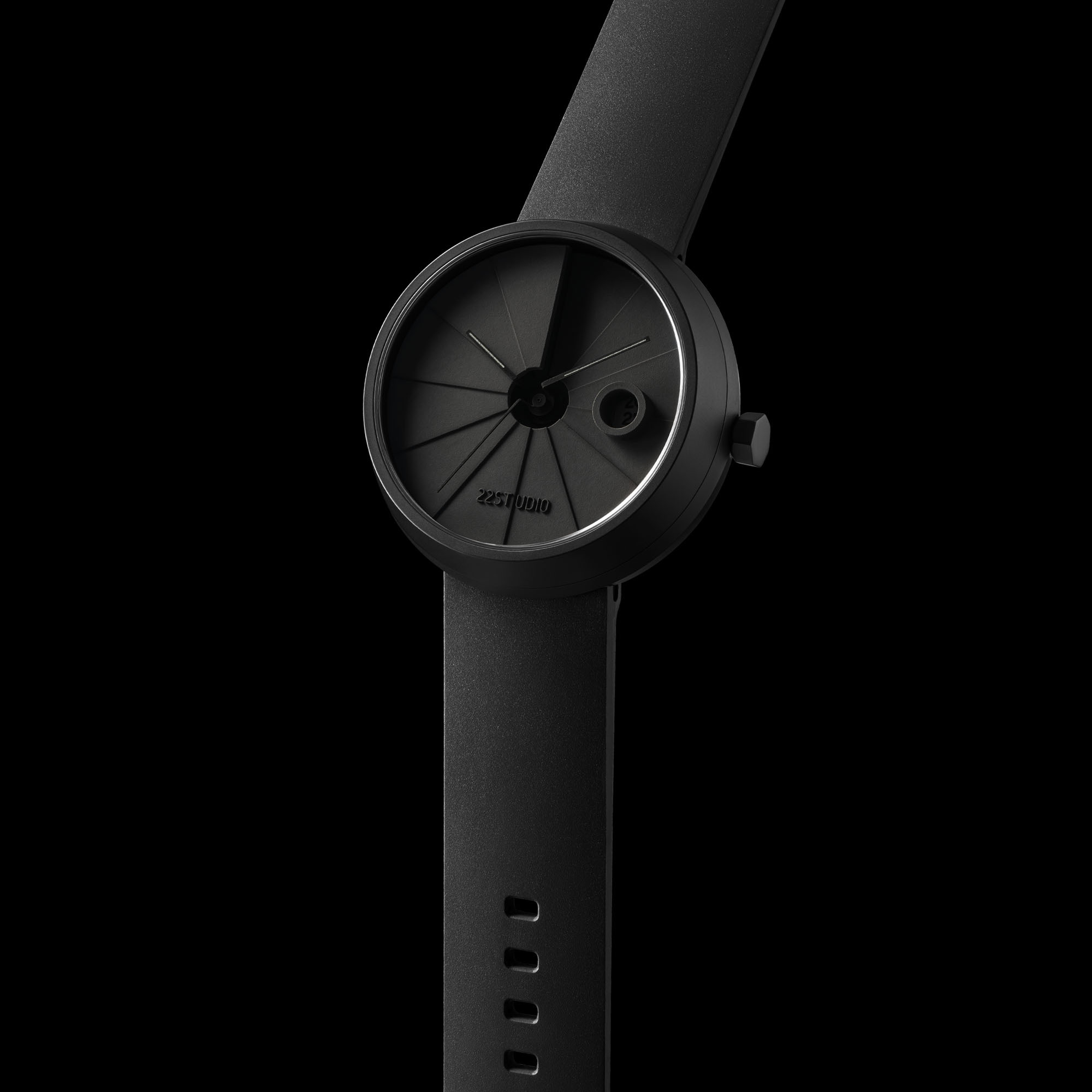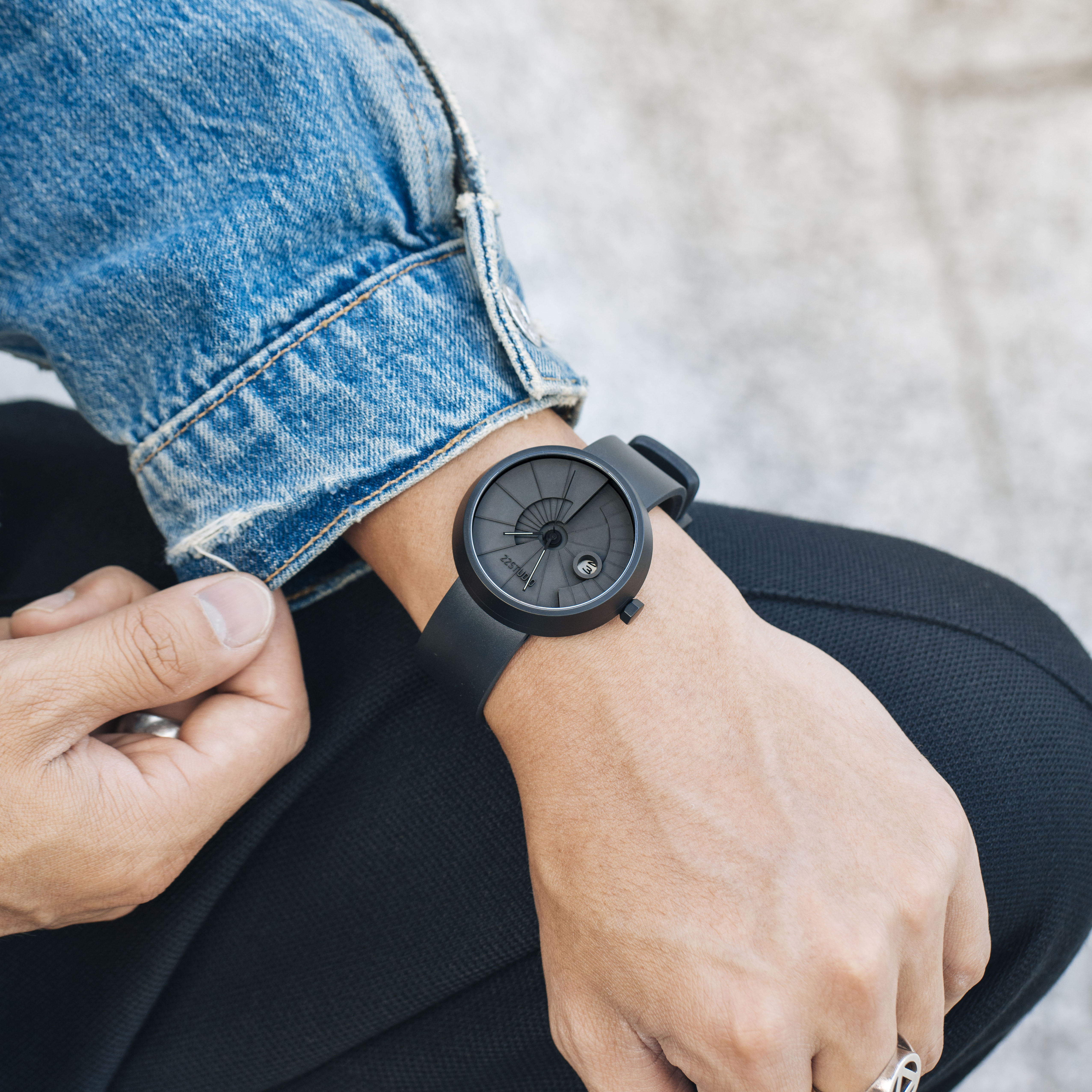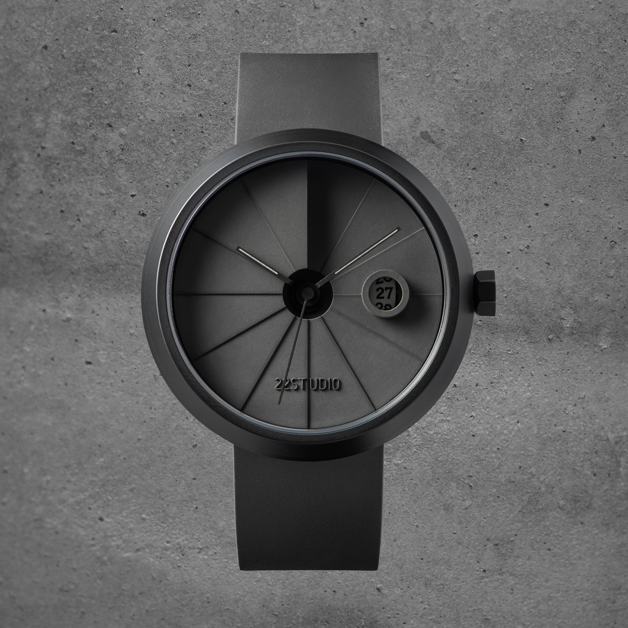 經典黯影款,霧面黑色PVD錶殼、灰黑色水泥錶盤、霧面黑色指針,配上黑色橡膠錶帶。呈現黑的不同層次。