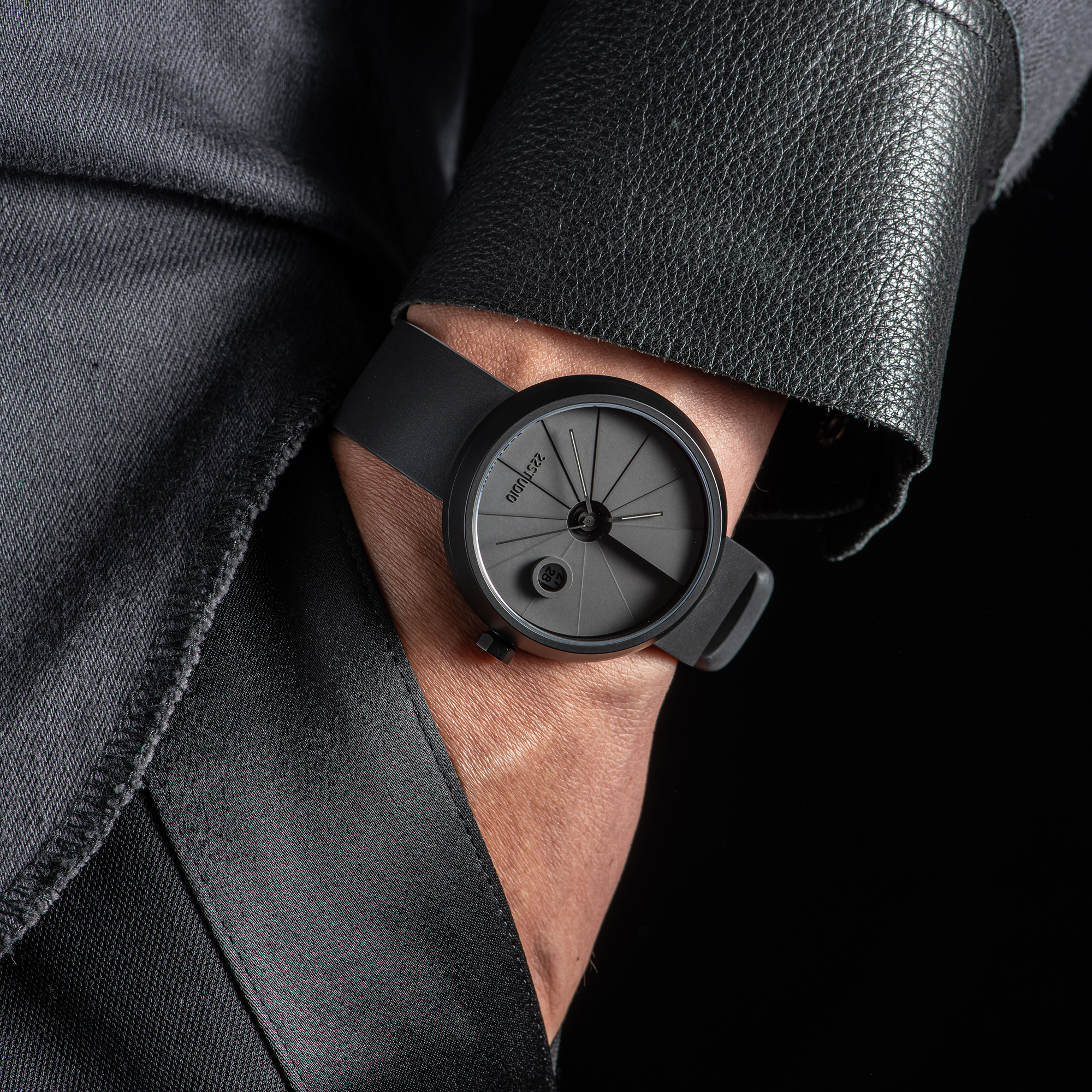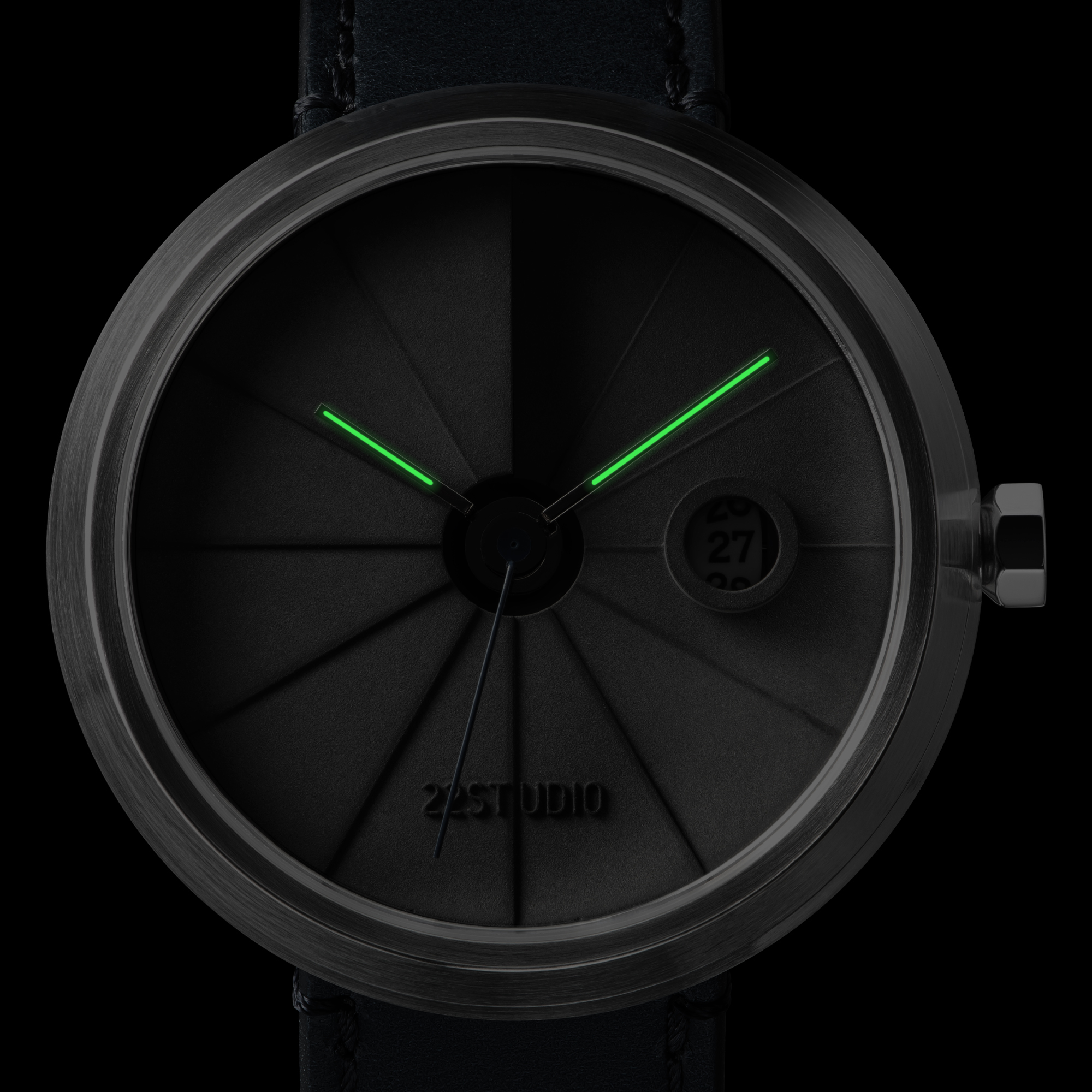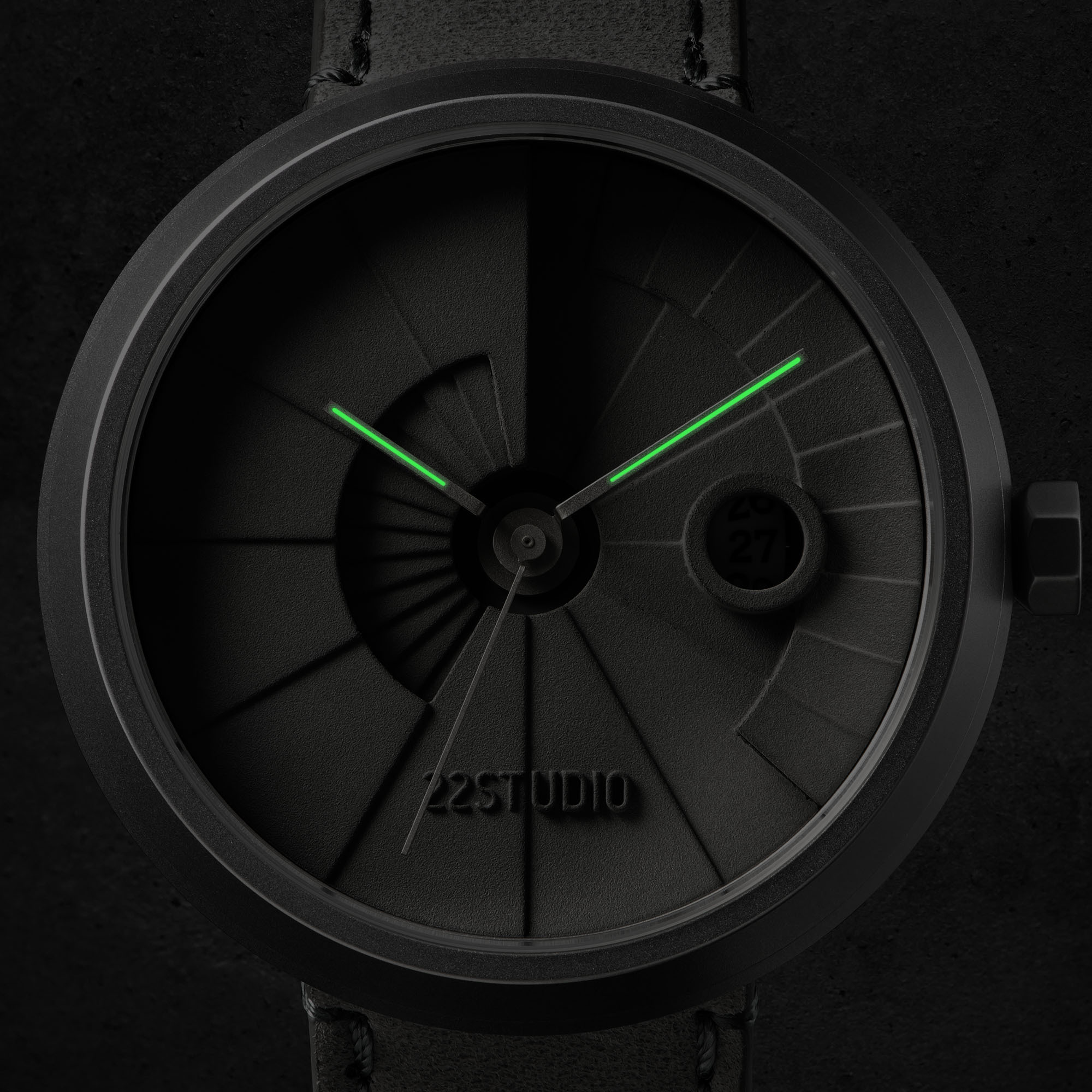 經典黯影款,霧面黑色PVD錶殼、灰黑色水泥錶盤、霧面黑色指針,配上黑色橡膠錶帶。呈現黑的不同層次。