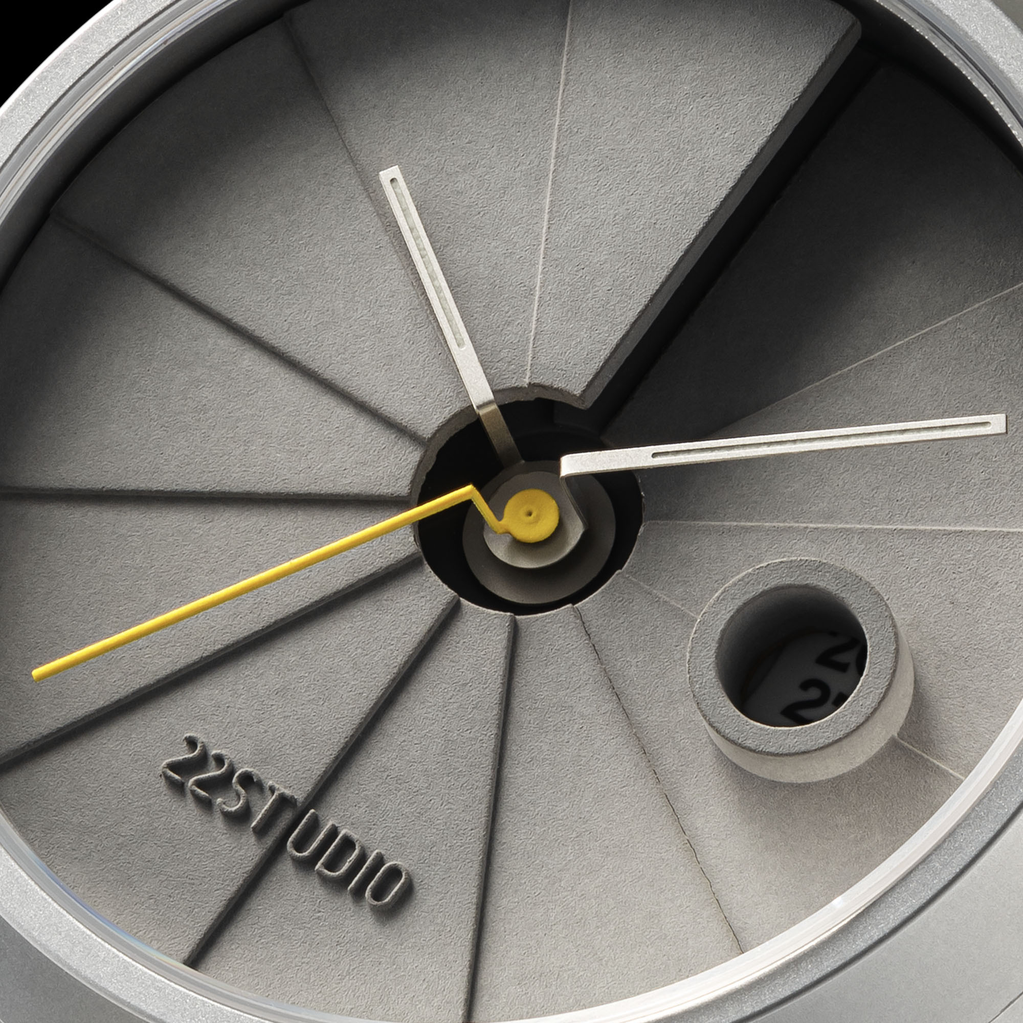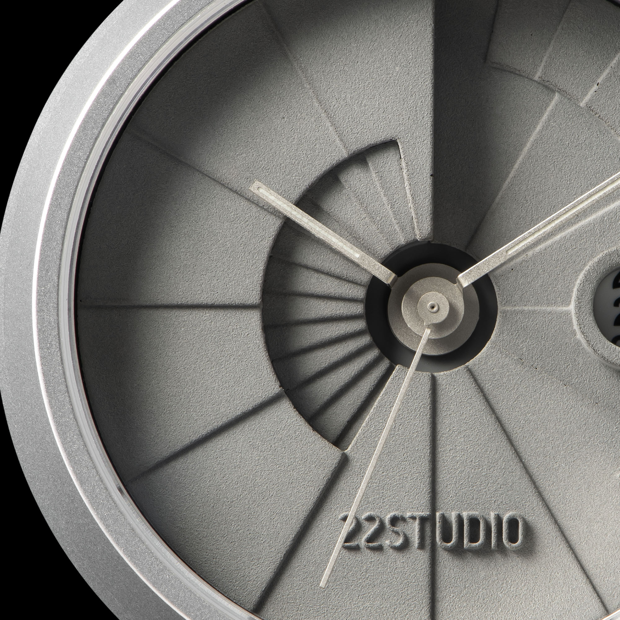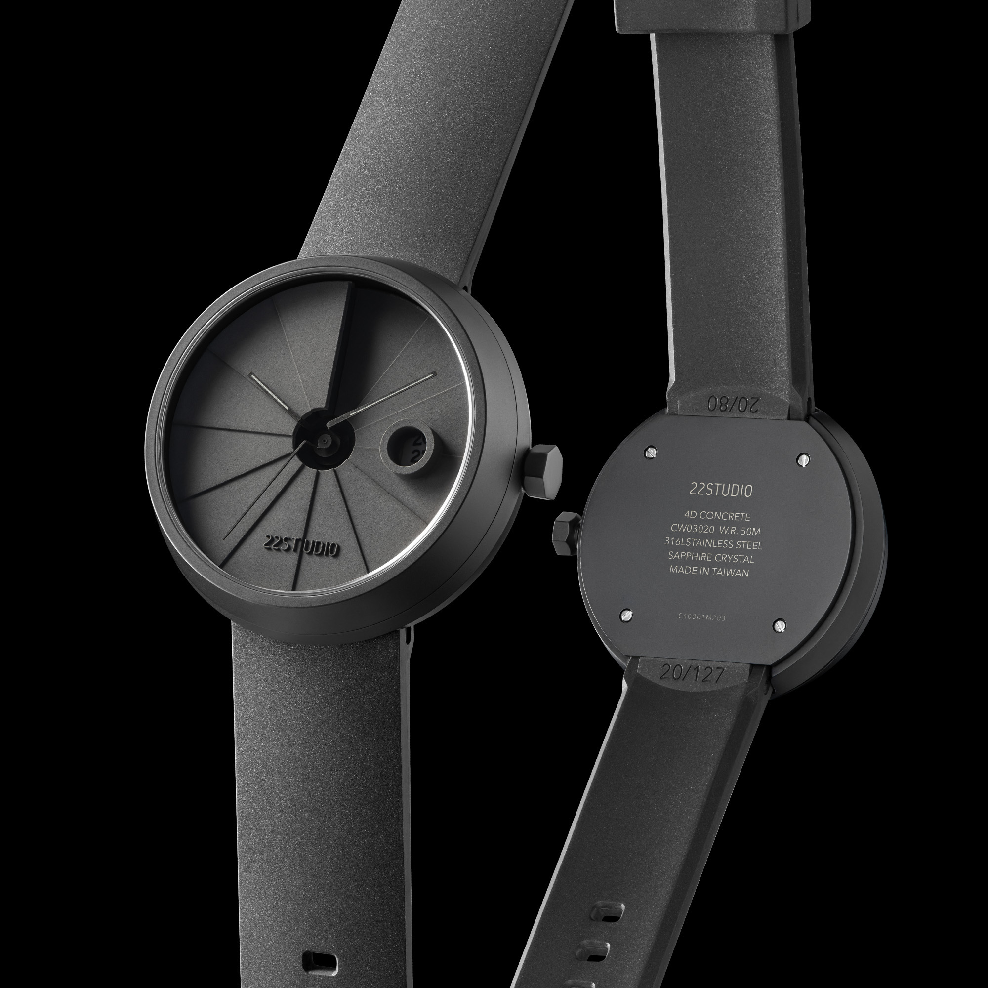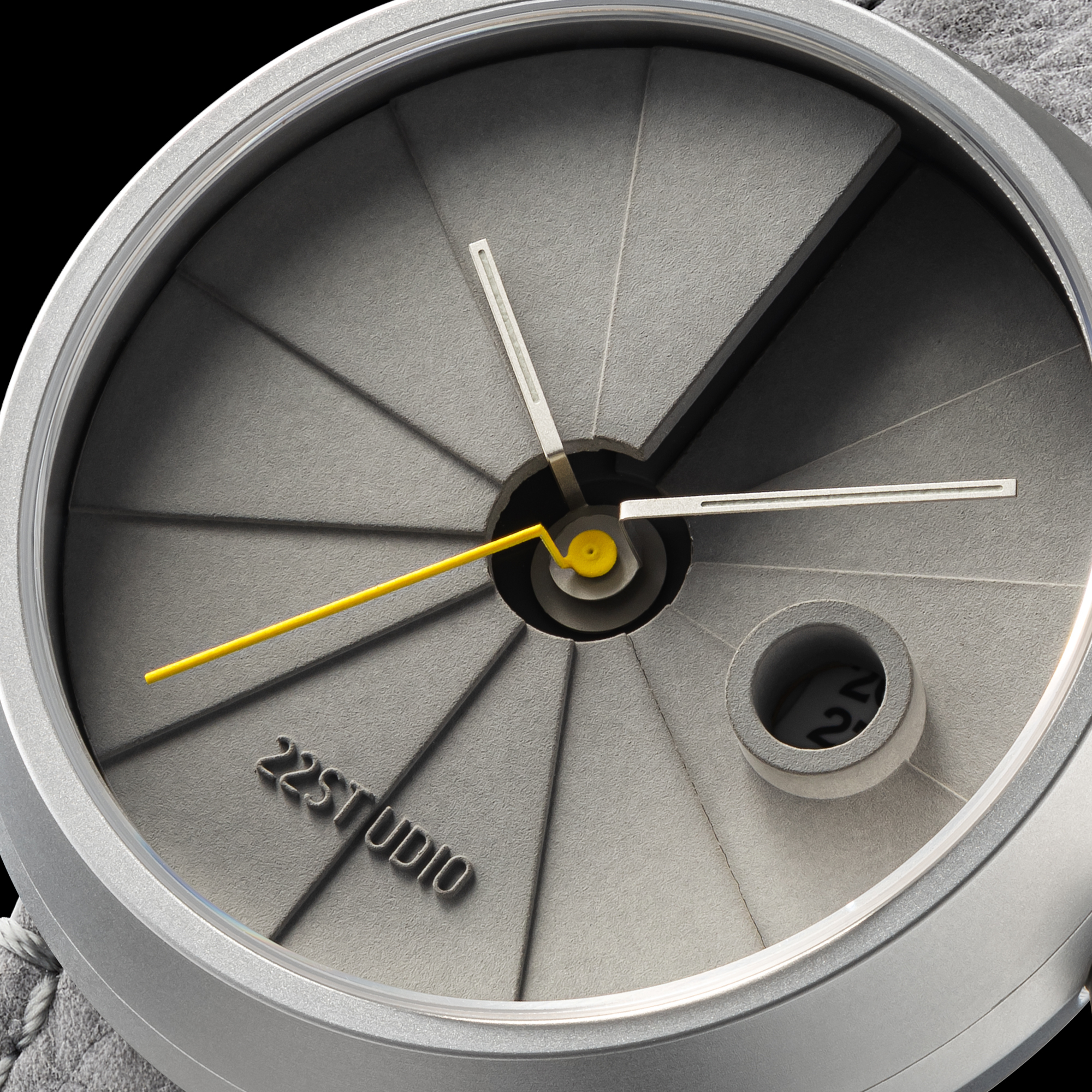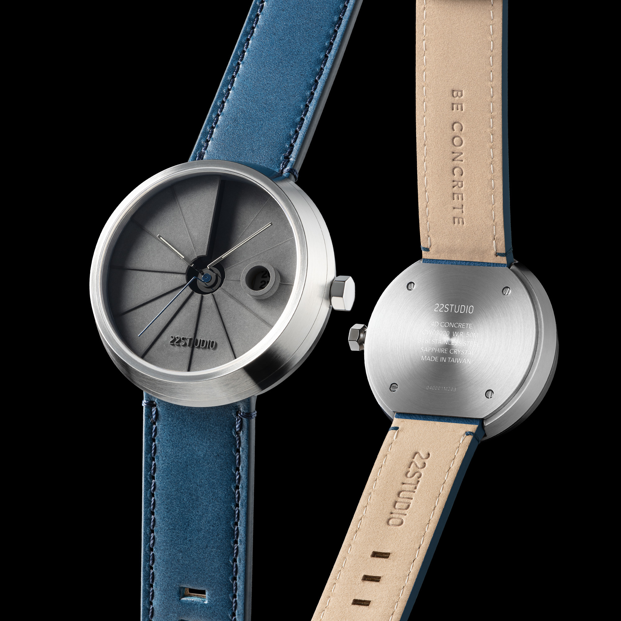 以22STUDIO獨家配方水泥灌製,經過14天養護後,手工修整毛邊。製作出結構堅固、紋理獨一無二的熟成水泥錶盤,最後以0.2mm的公差進行尺寸檢驗,以確保品質。