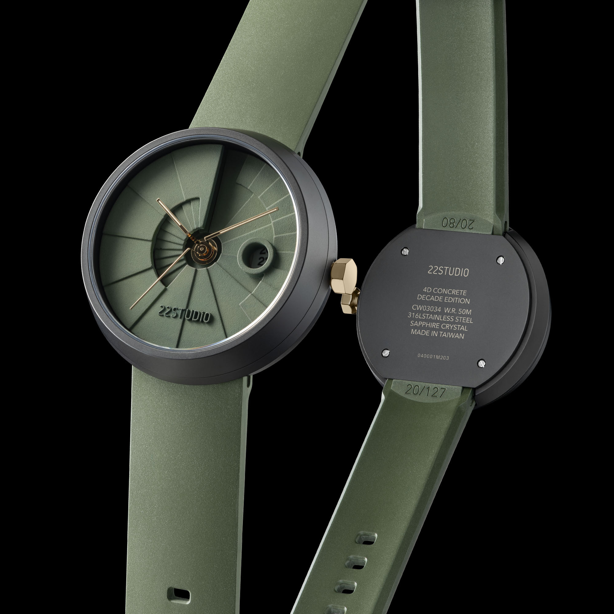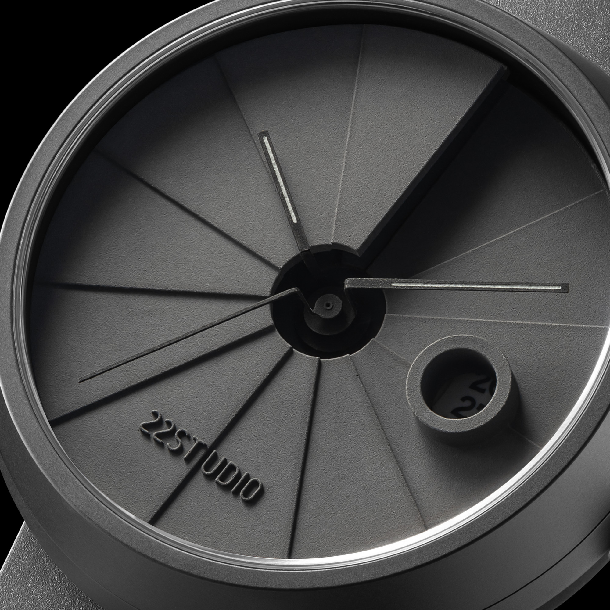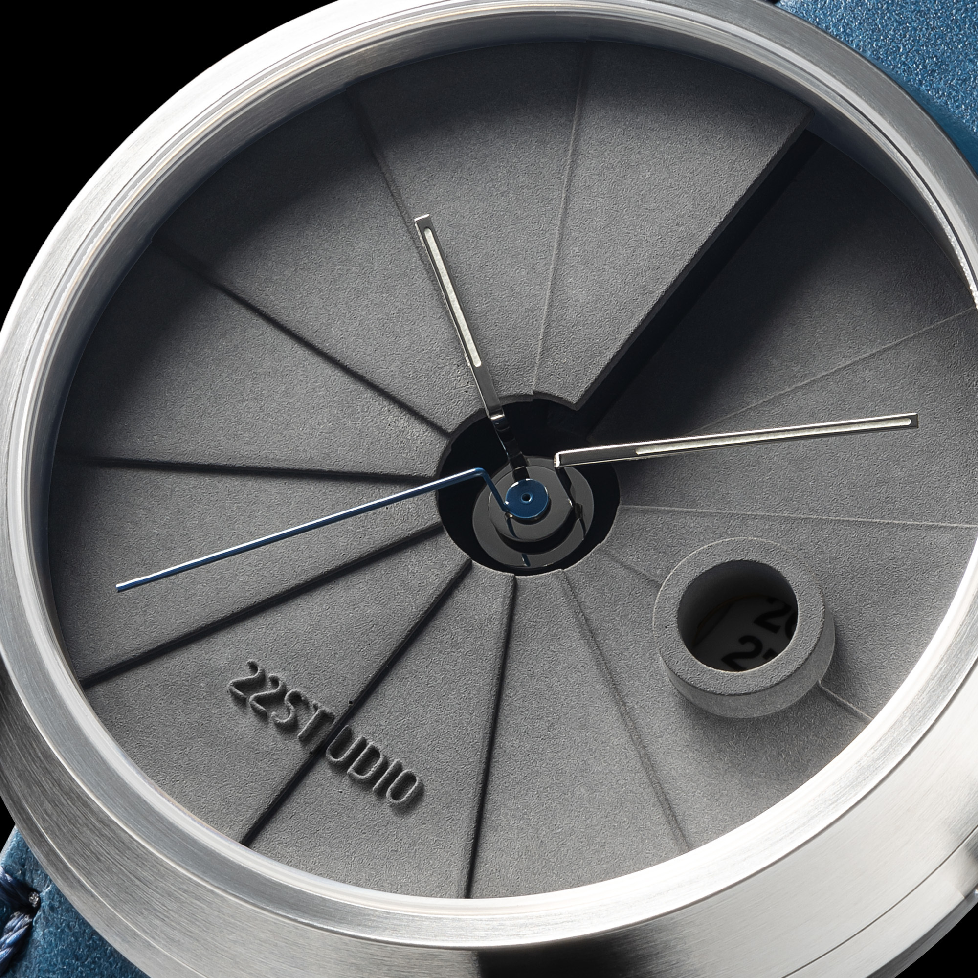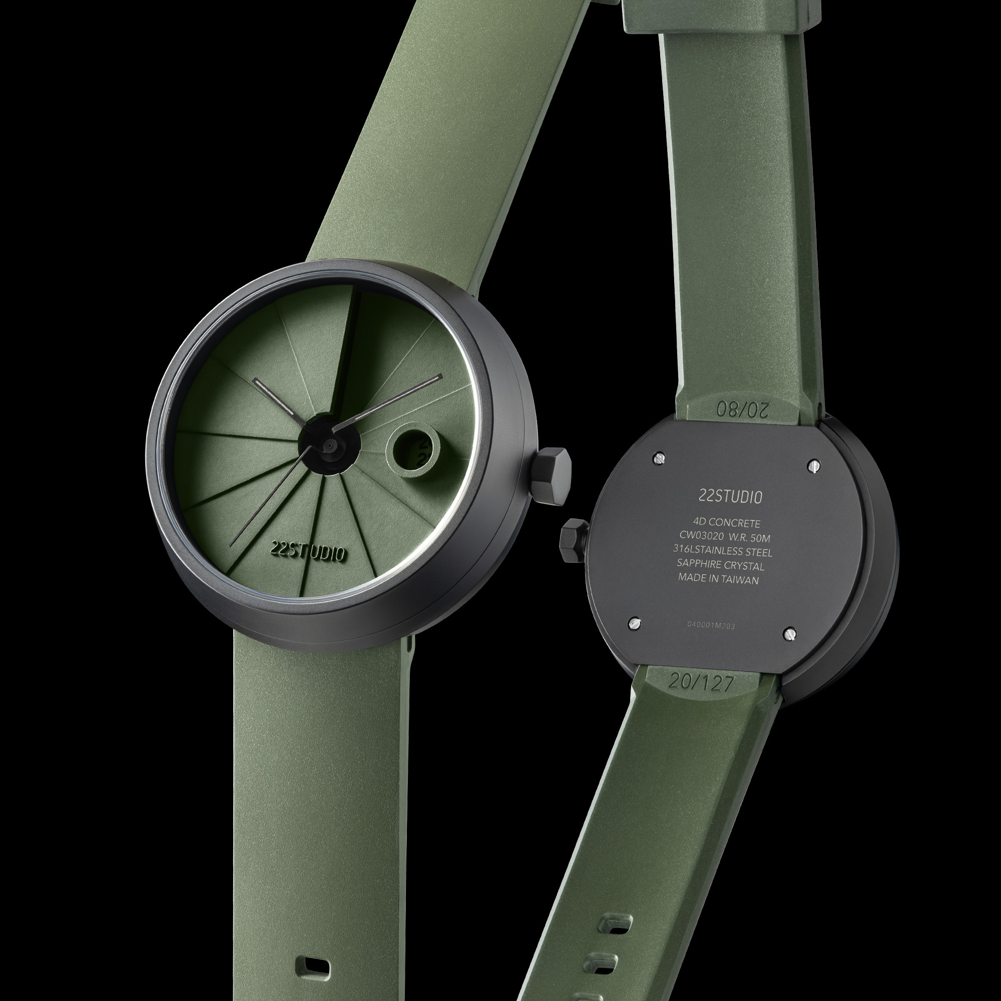 以22STUDIO獨家配方水泥灌製,經過14天養護後,手工修整毛邊。製作出結構堅固、紋理獨一無二的熟成水泥錶盤,最後以0.2mm的公差進行尺寸檢驗,以確保品質。