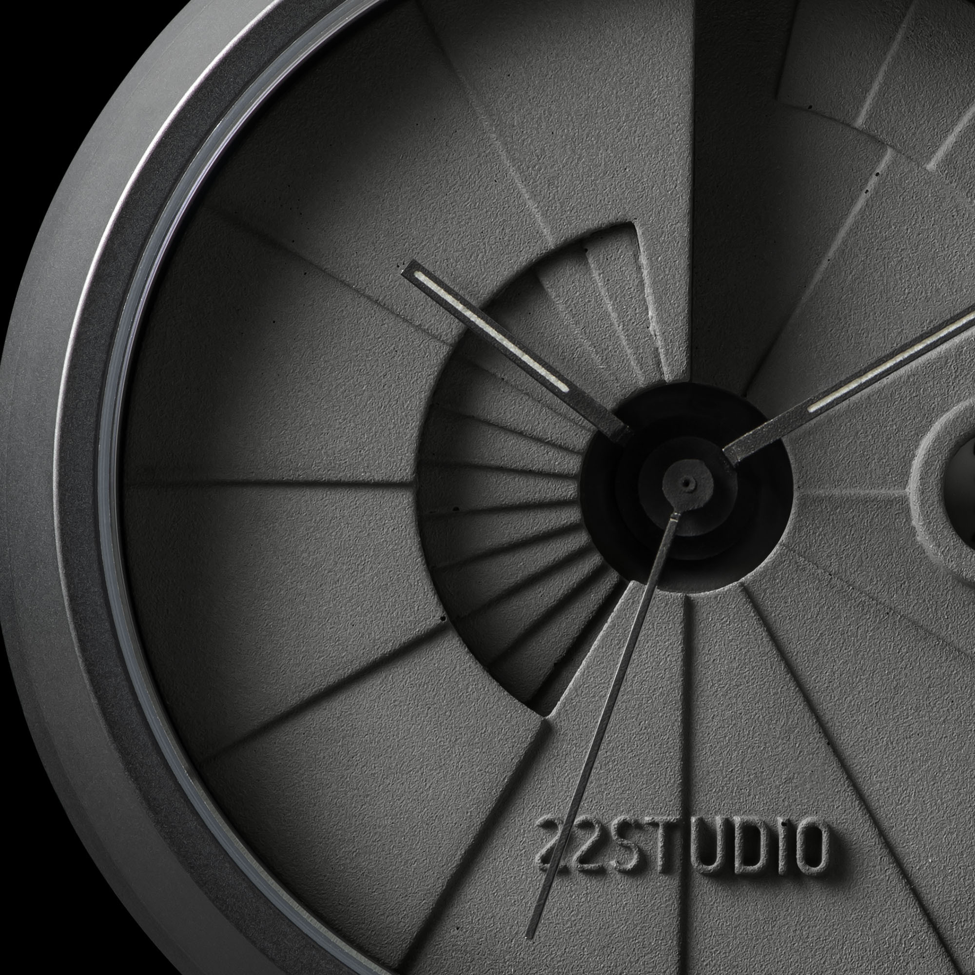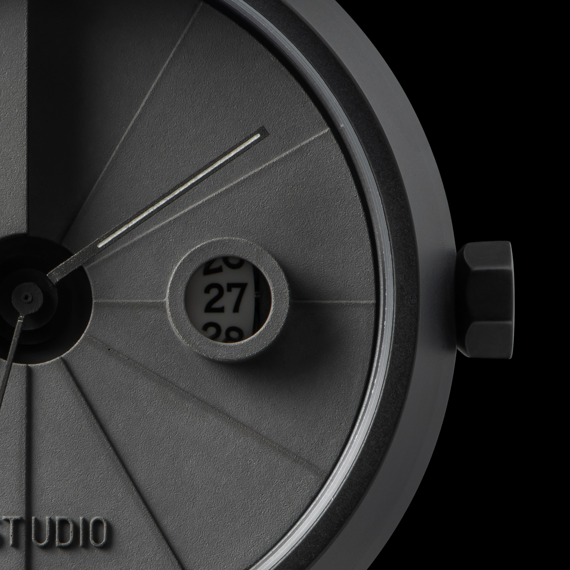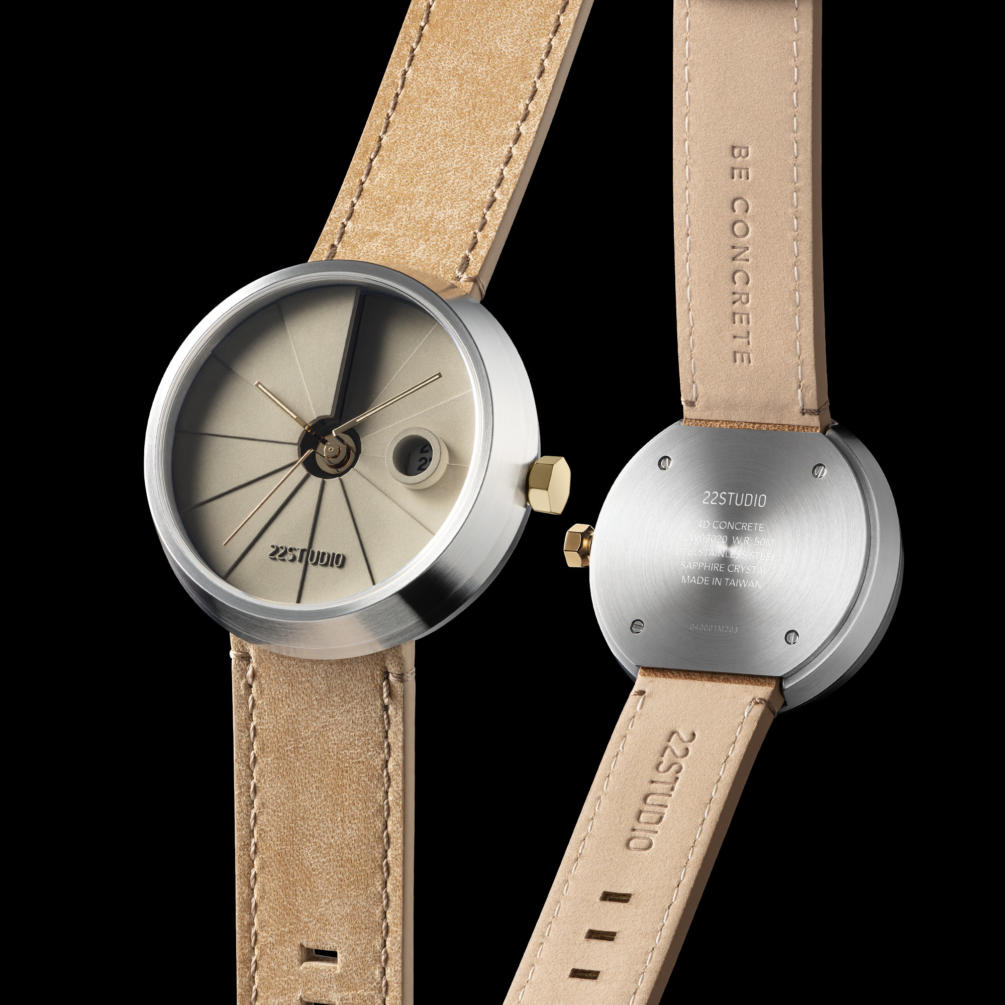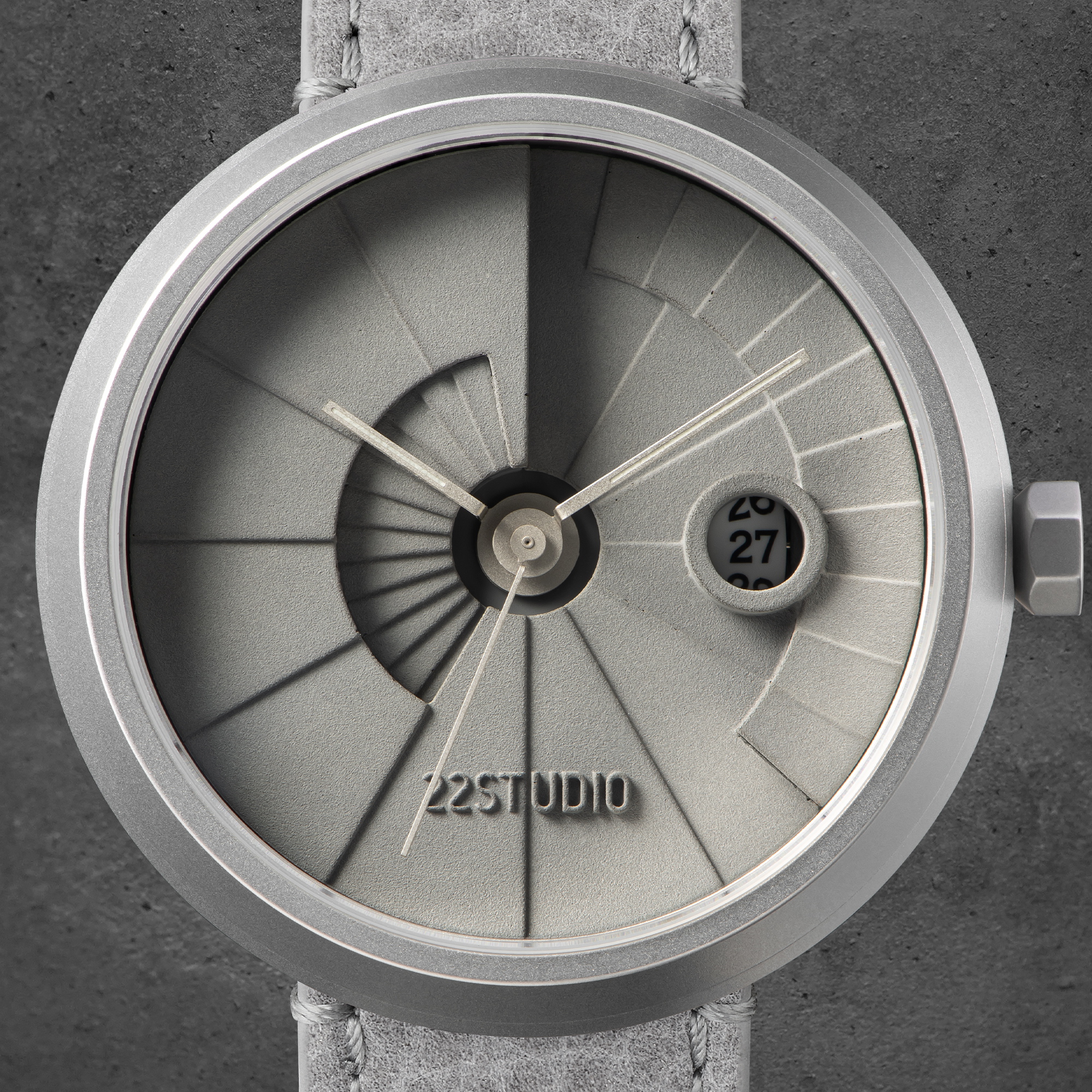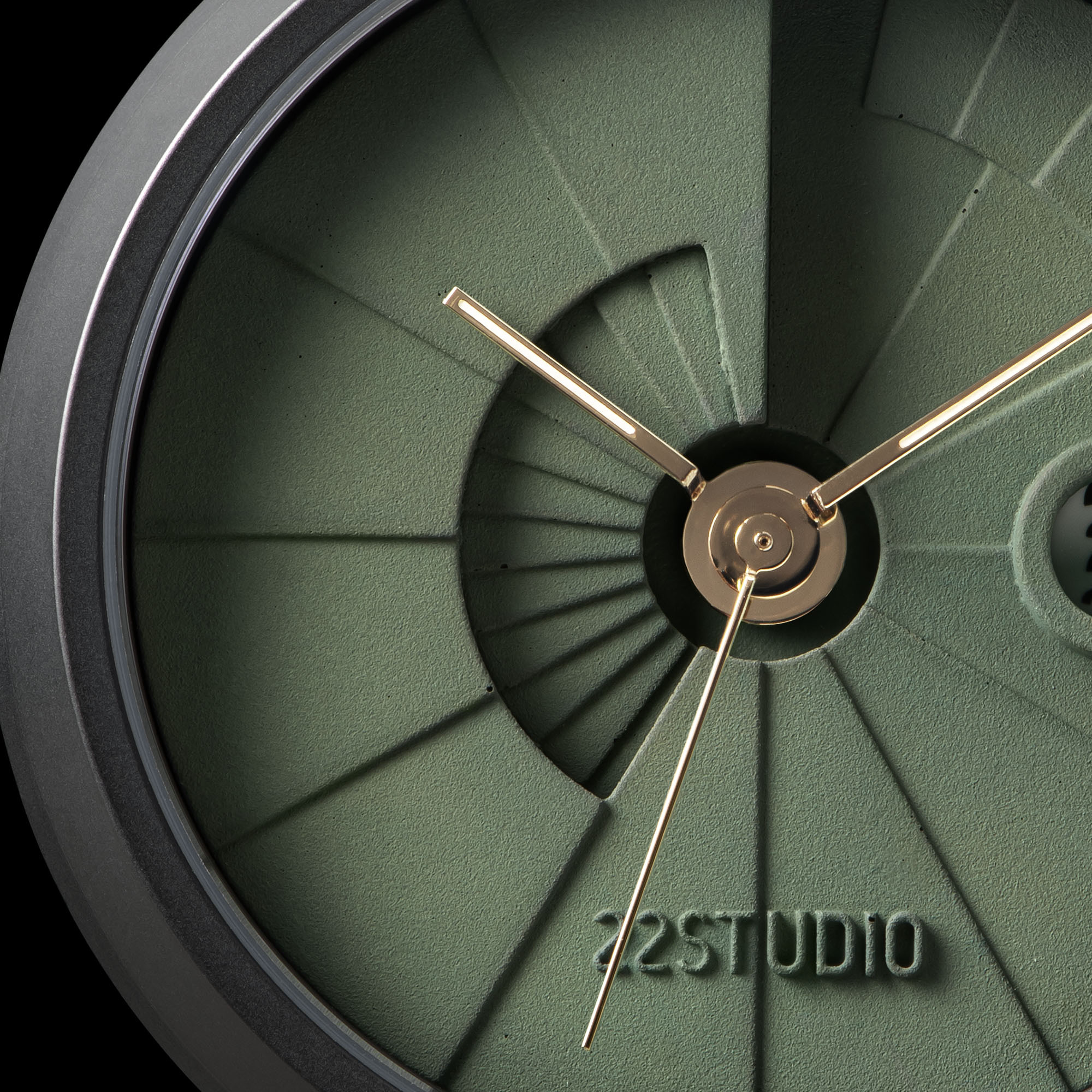 以22STUDIO獨家配方水泥灌製,經過14天養護後,手工修整毛邊。製作出結構堅固、紋理獨一無二的熟成水泥錶盤,最後以0.2mm的公差進行尺寸檢驗,以確保品質。