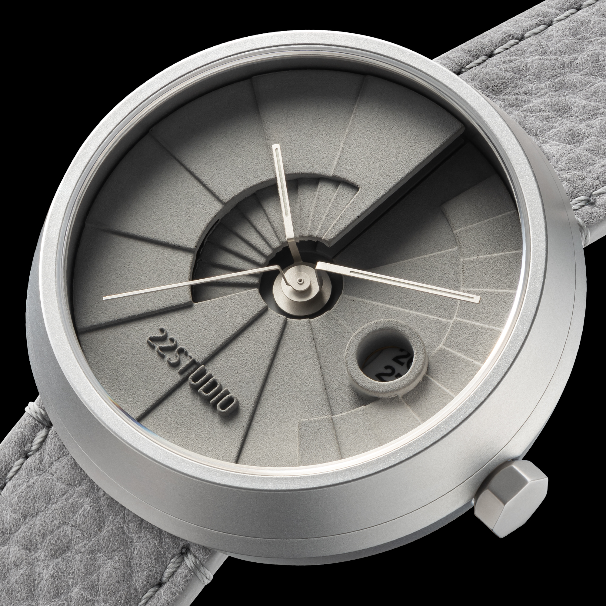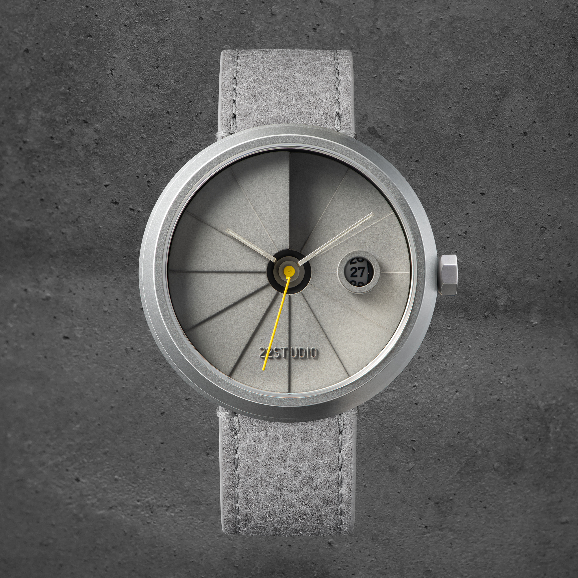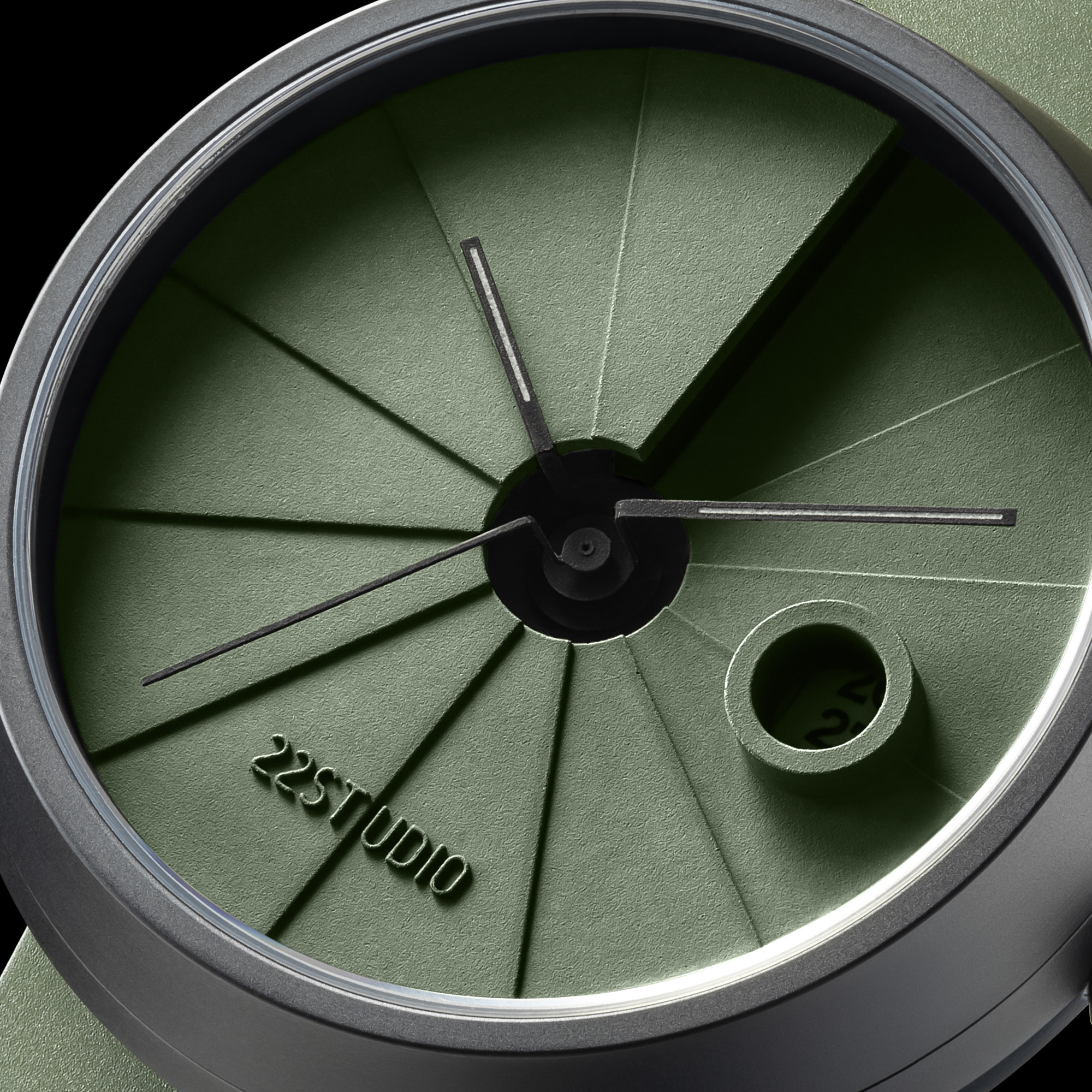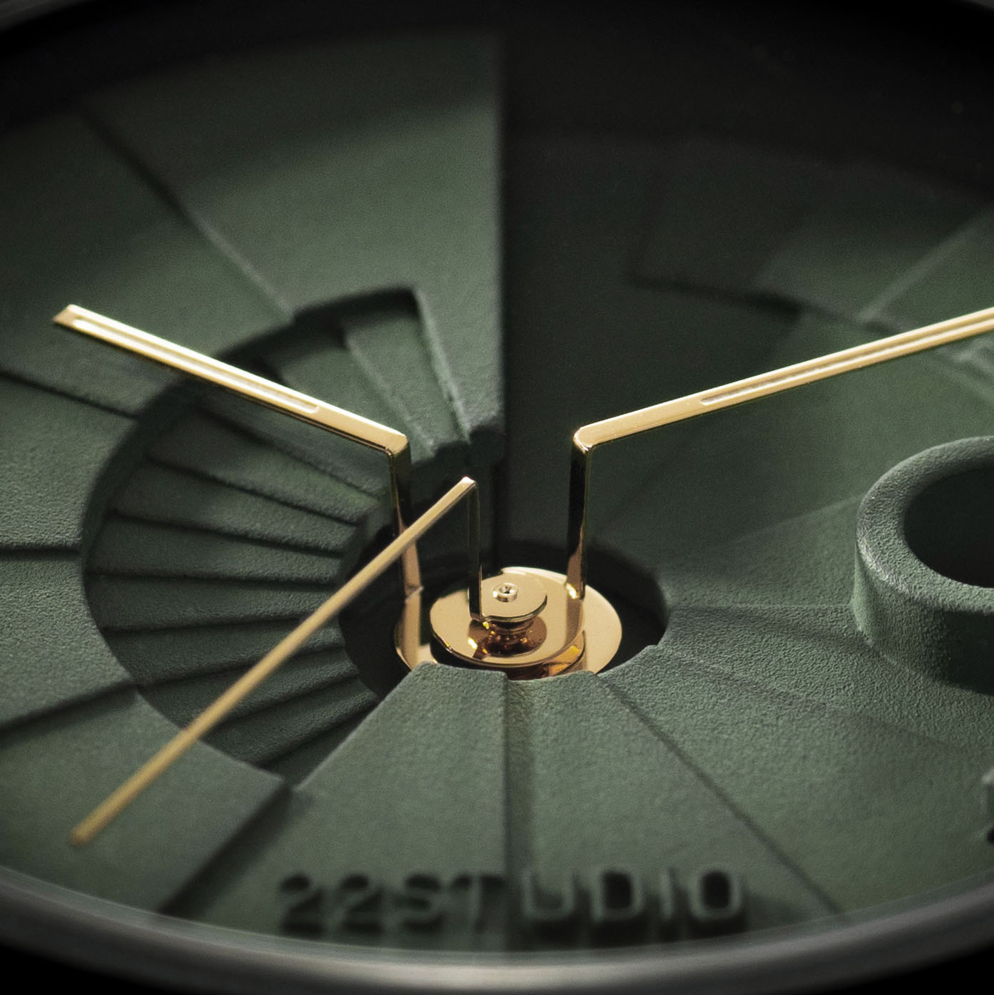 以22STUDIO獨家配方水泥灌製,經過14天養護後,手工修整毛邊。製作出結構堅固、紋理獨一無二的熟成水泥錶盤,最後以0.2mm的公差進行尺寸檢驗,以確保品質。