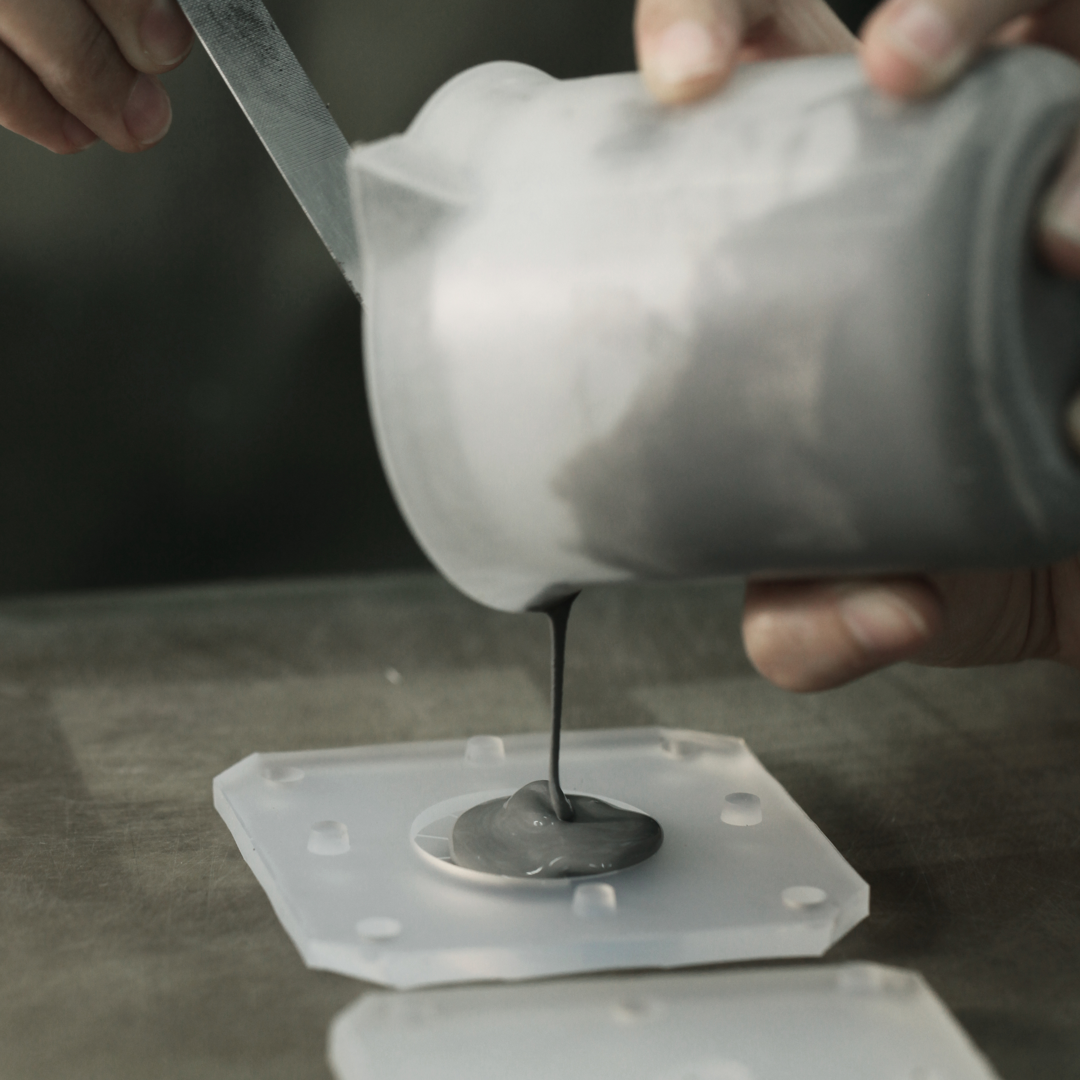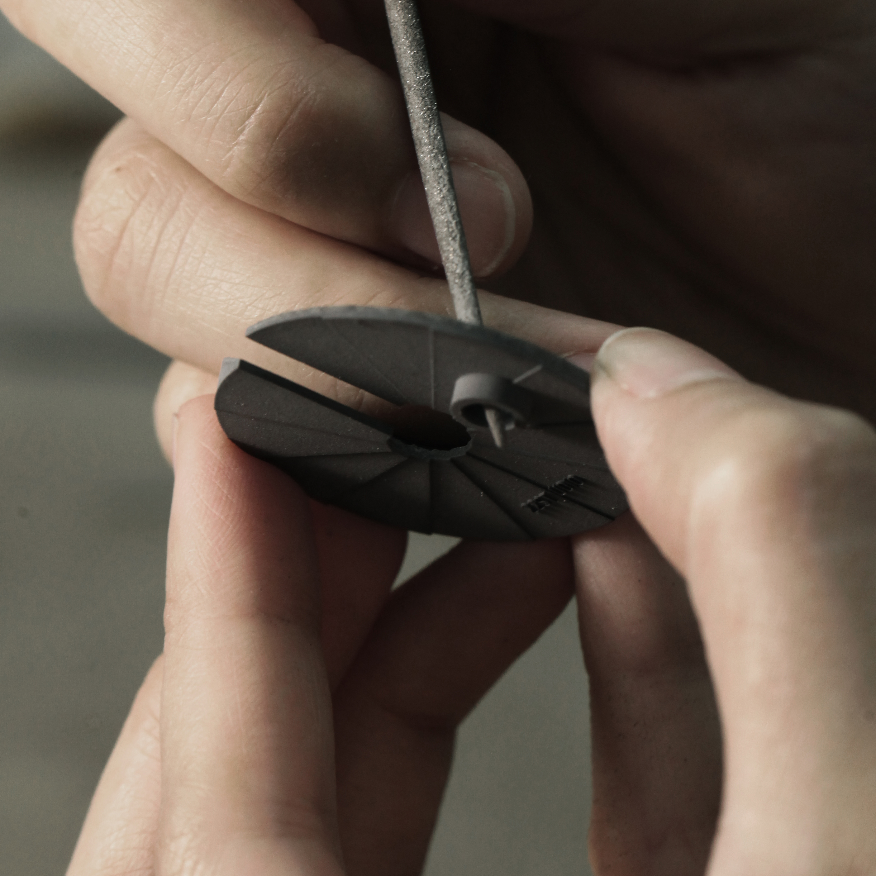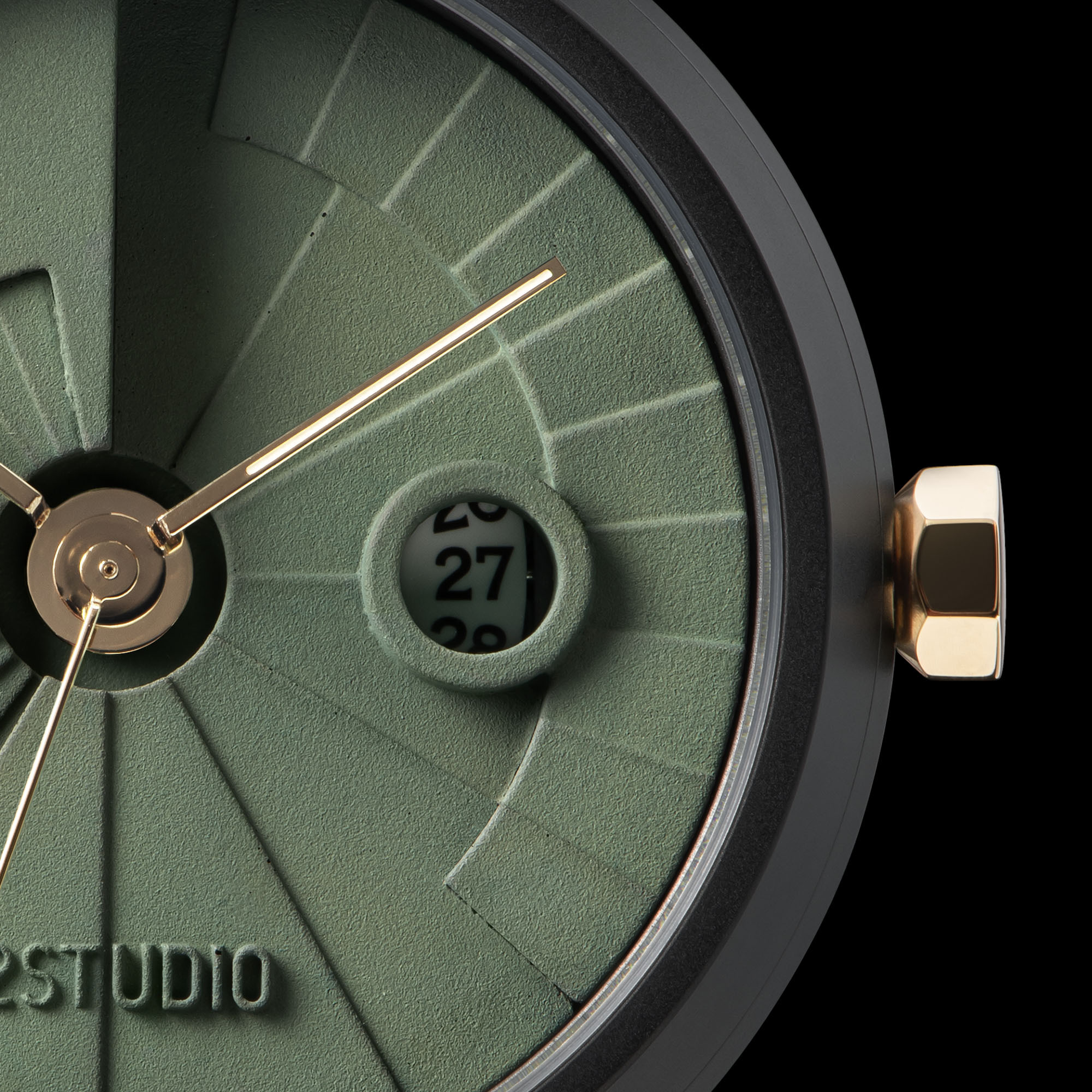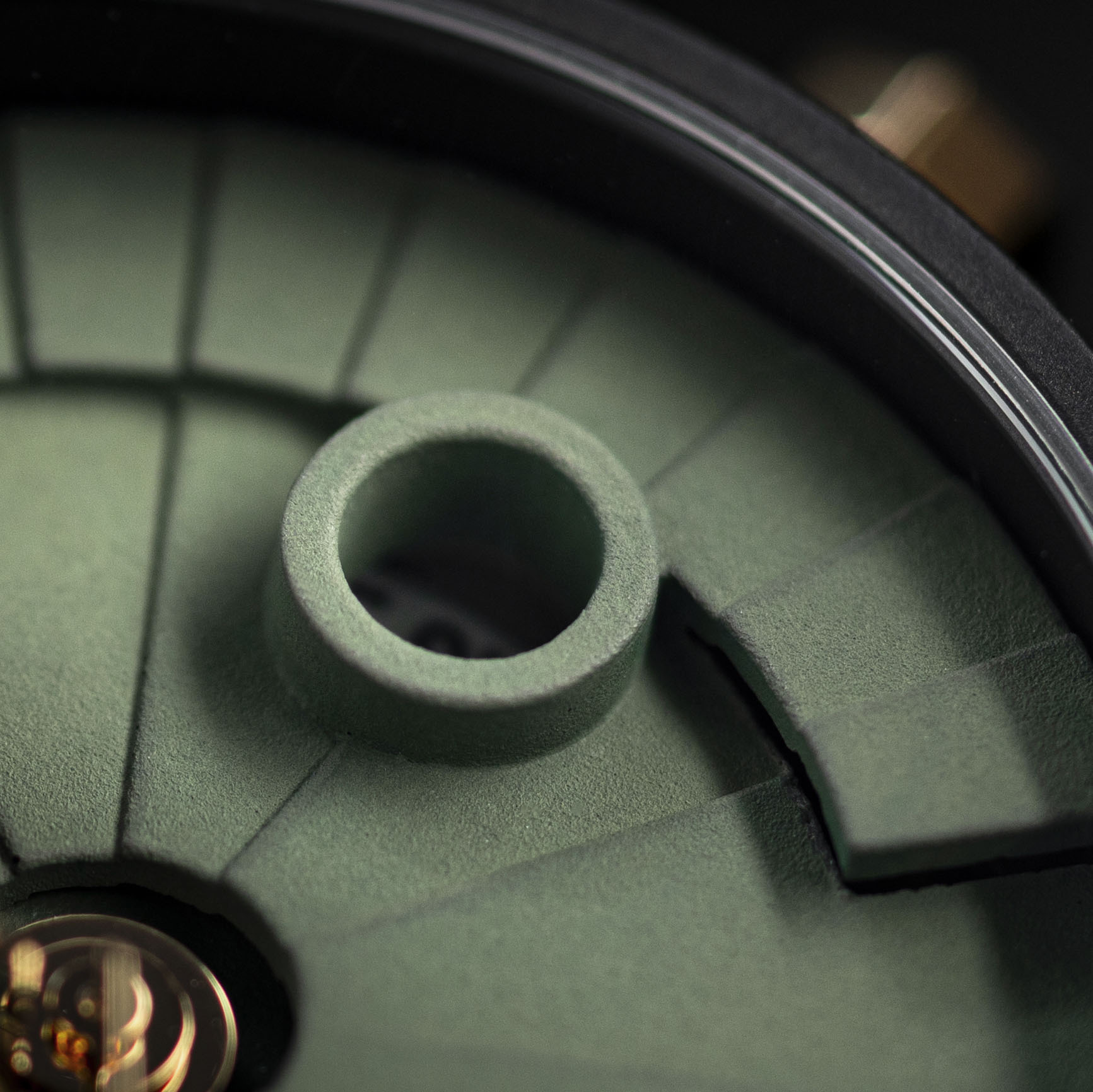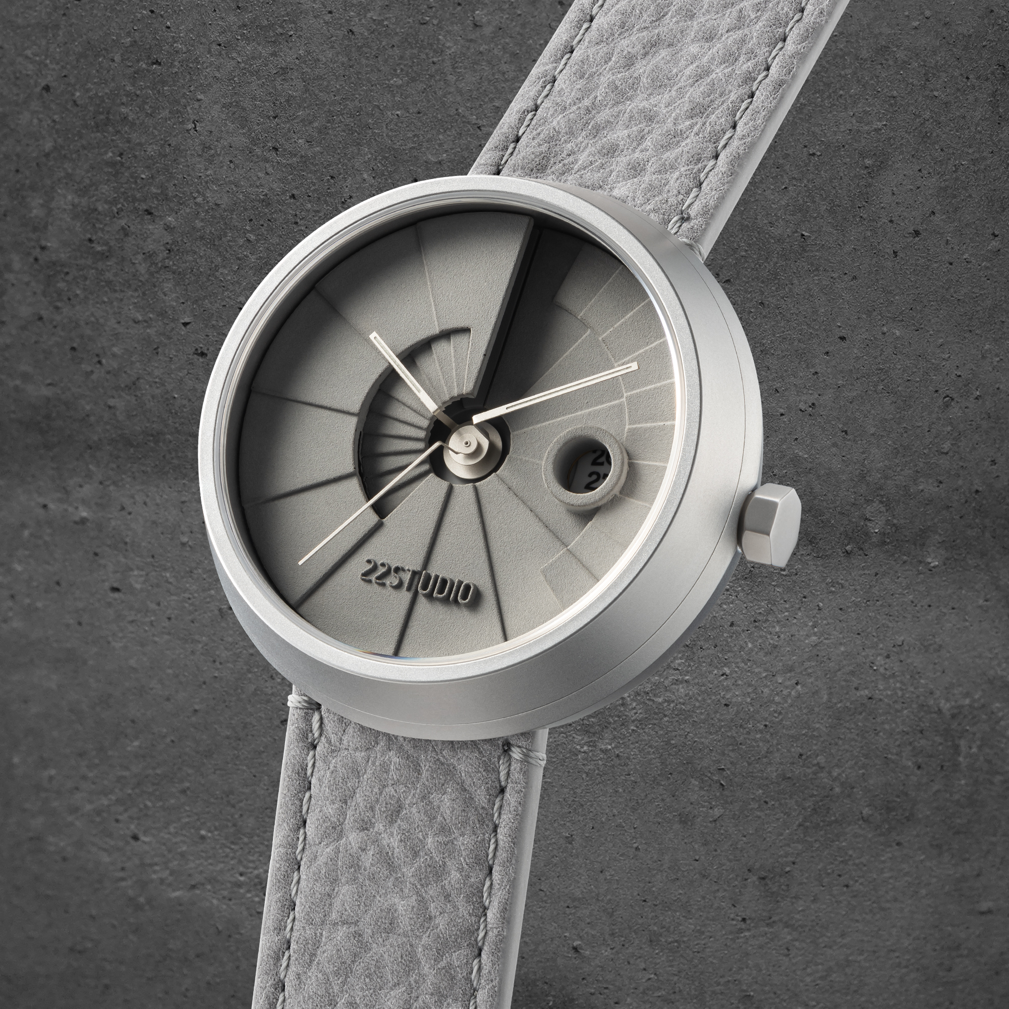 以22STUDIO獨家配方水泥灌製,經過14天養護後,手工修整毛邊。製作出結構堅固、紋理獨一無二的熟成水泥錶盤,最後以0.2mm的公差進行尺寸檢驗,以確保品質。
