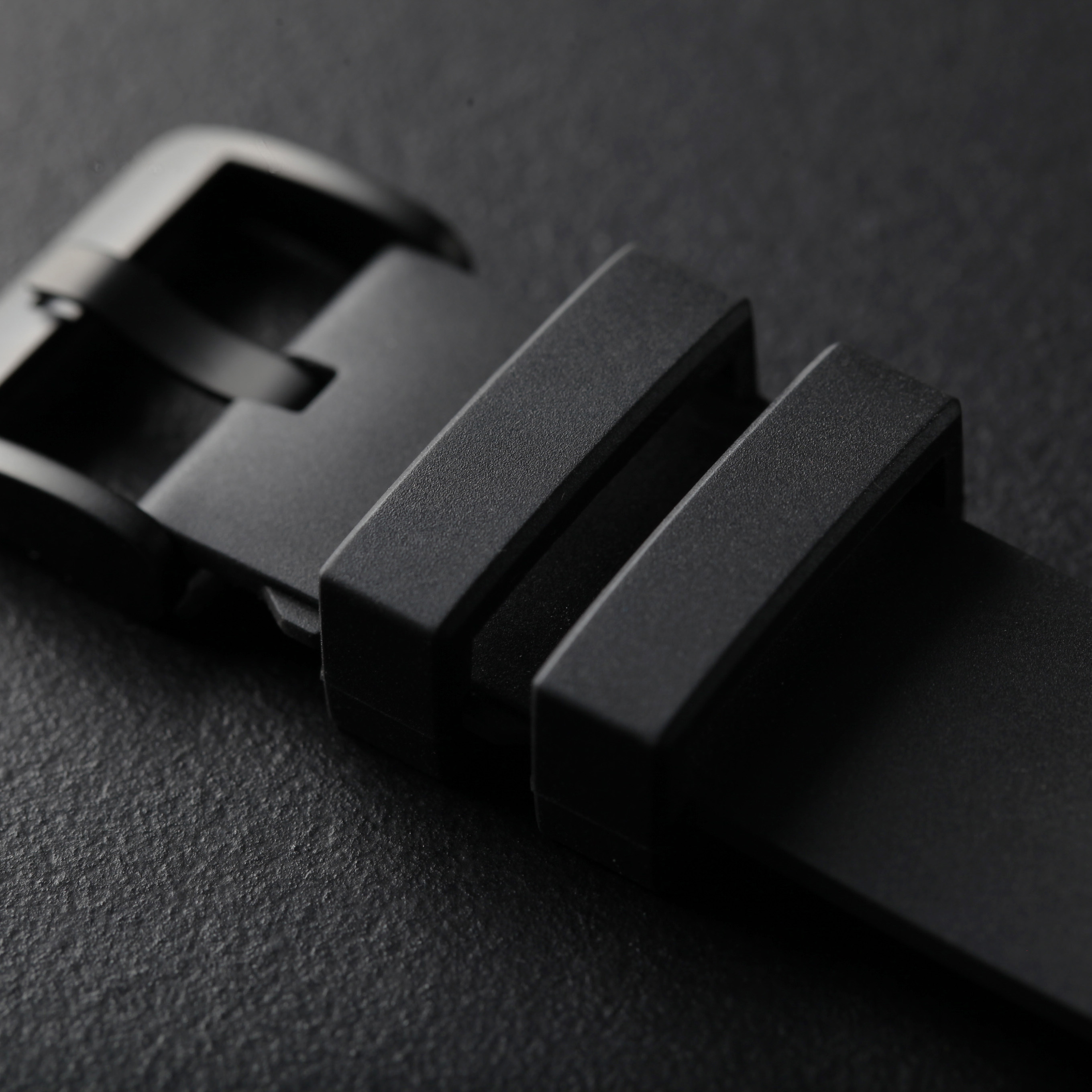 採用與Apple Watch運動型錶帶同級「氟橡膠」錶帶,抗高溫、抗酸鹼、吸震、耐用性都非常的優異,而其中作為錶帶最大的優點是,它比重很高,重量比較重,所以配戴上感覺扎實、手感比較好。