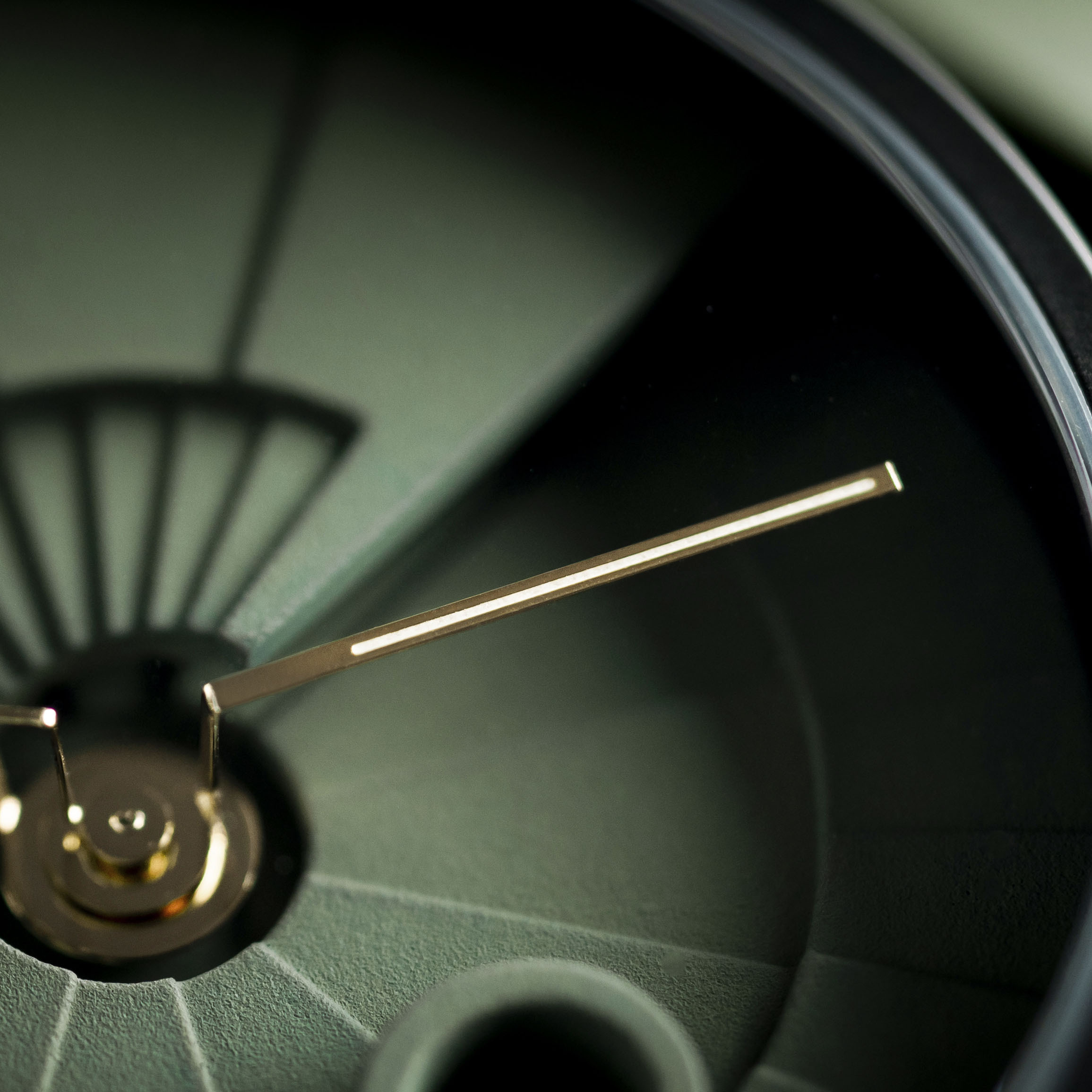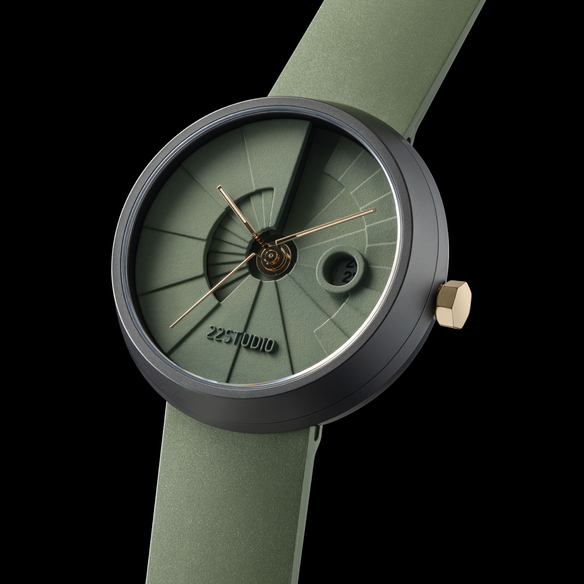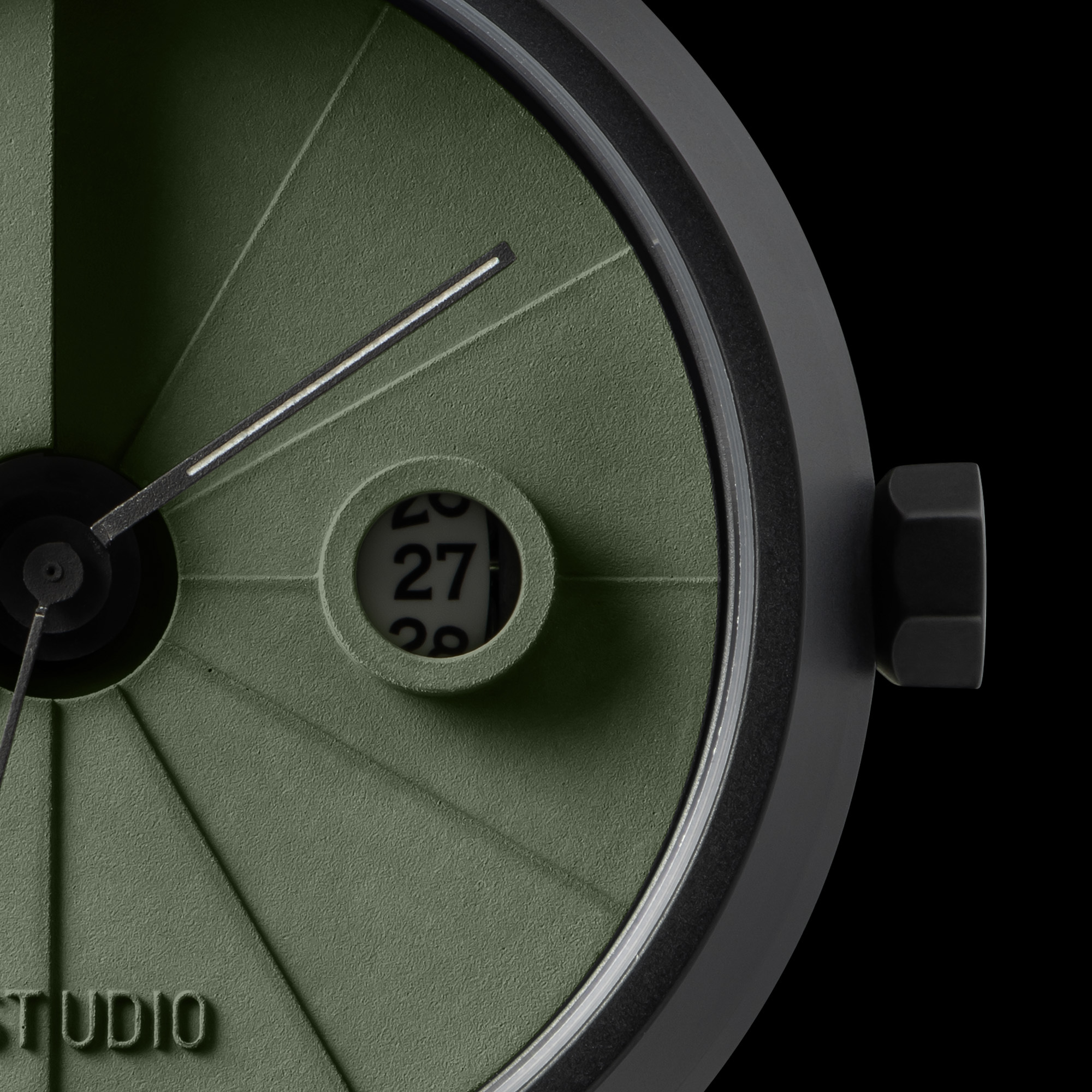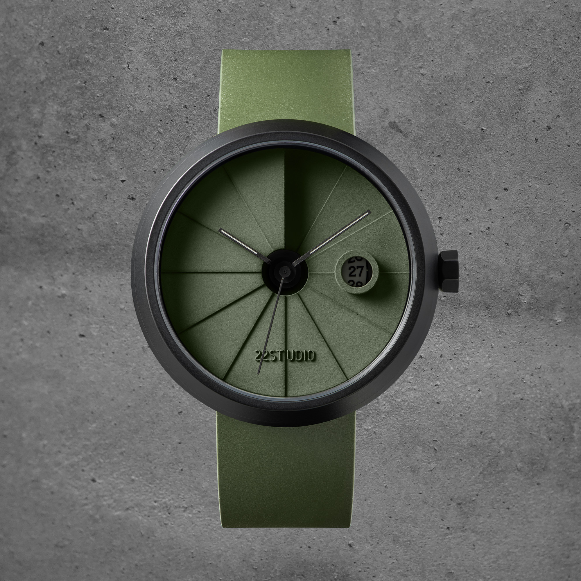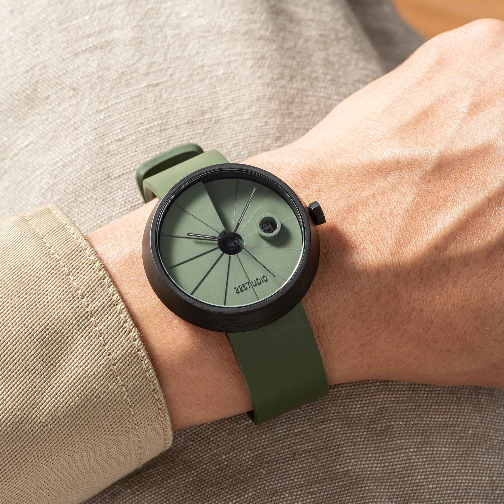 戶外風十足,霧面黑色PVD錶殼、松綠色水泥錶盤、霧面黑色指針,配上墨綠橡膠錶帶。非常百搭大地色系衣著,戶外機能服飾和登山鞋也超適合。