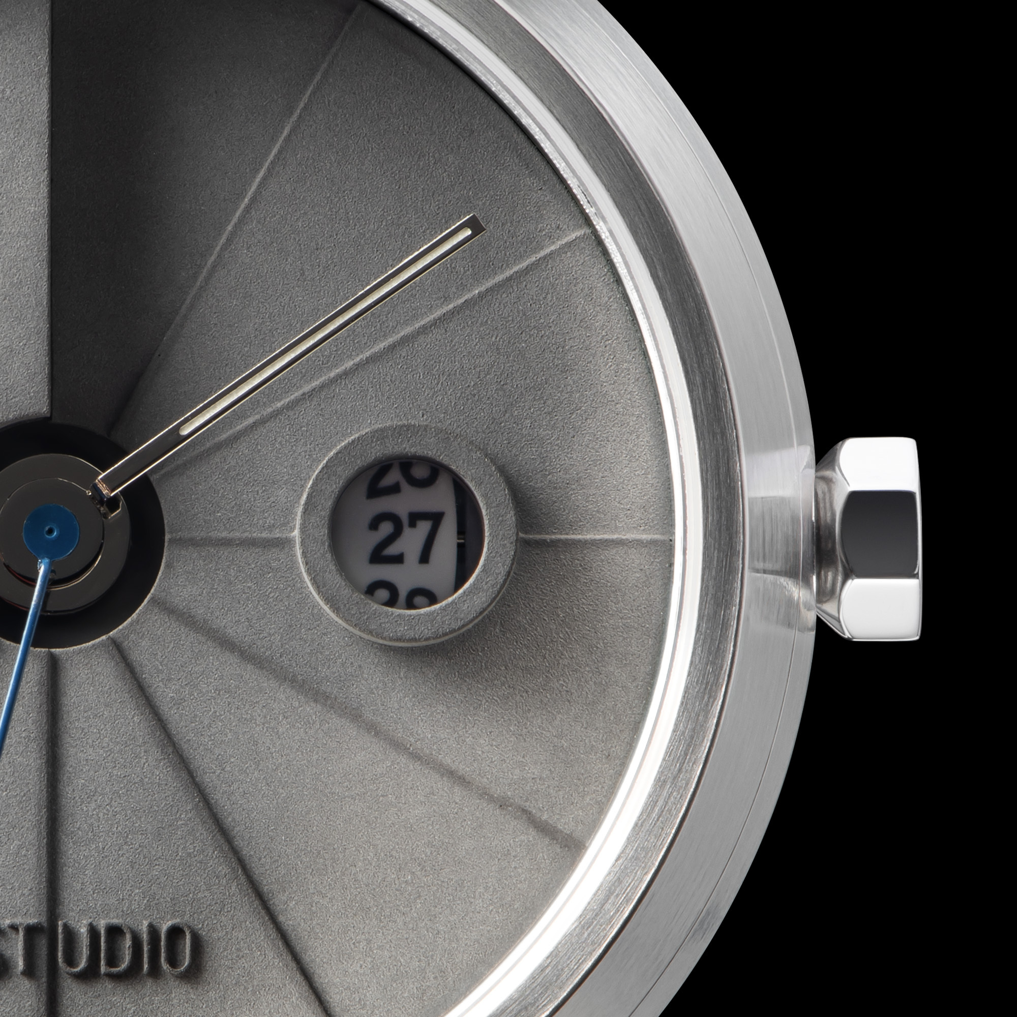 水泥感最高的標誌性配色,高密度水泥原色錶盤、霧面不銹鋼錶殼、搭配霧面灰指針、灰色義大利植鞣皮革。
