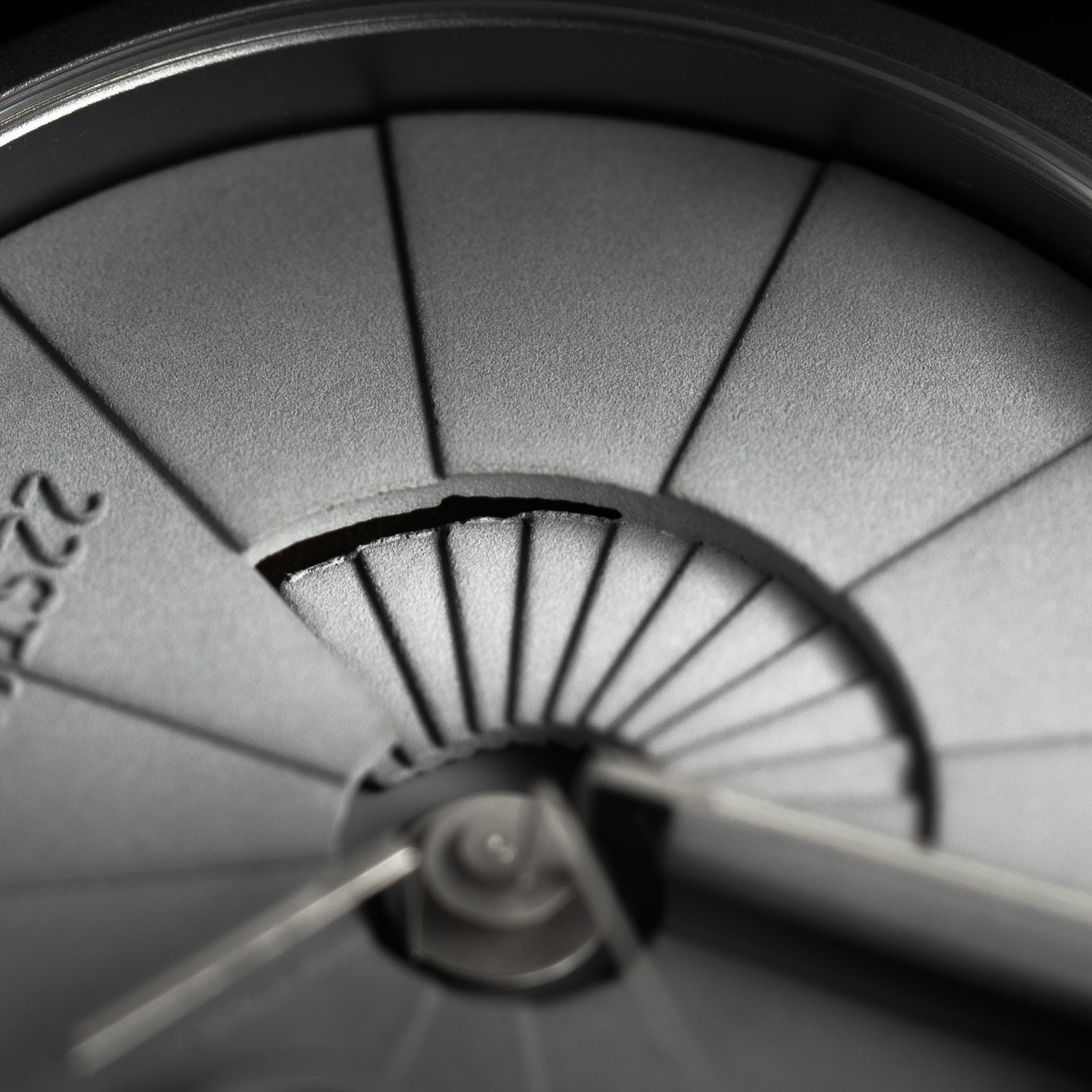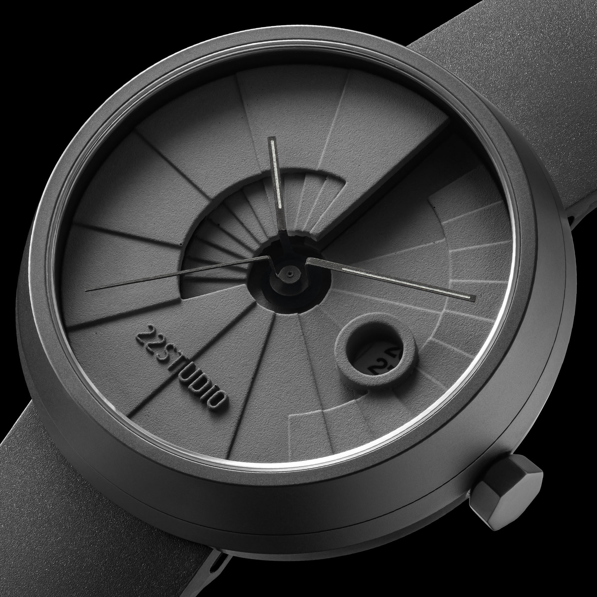 從0分開始,外圍增加一圈以2分鐘為一階的樓梯,一共11階,視覺上走得更快。從0分開始,內圍也增加一圈以2分鐘為一階的樓梯,一共16階,視覺上逆時針走。三座樓梯往下都延伸到底部的黑暗之中,更強調階梯高低差造成的光影變化。
