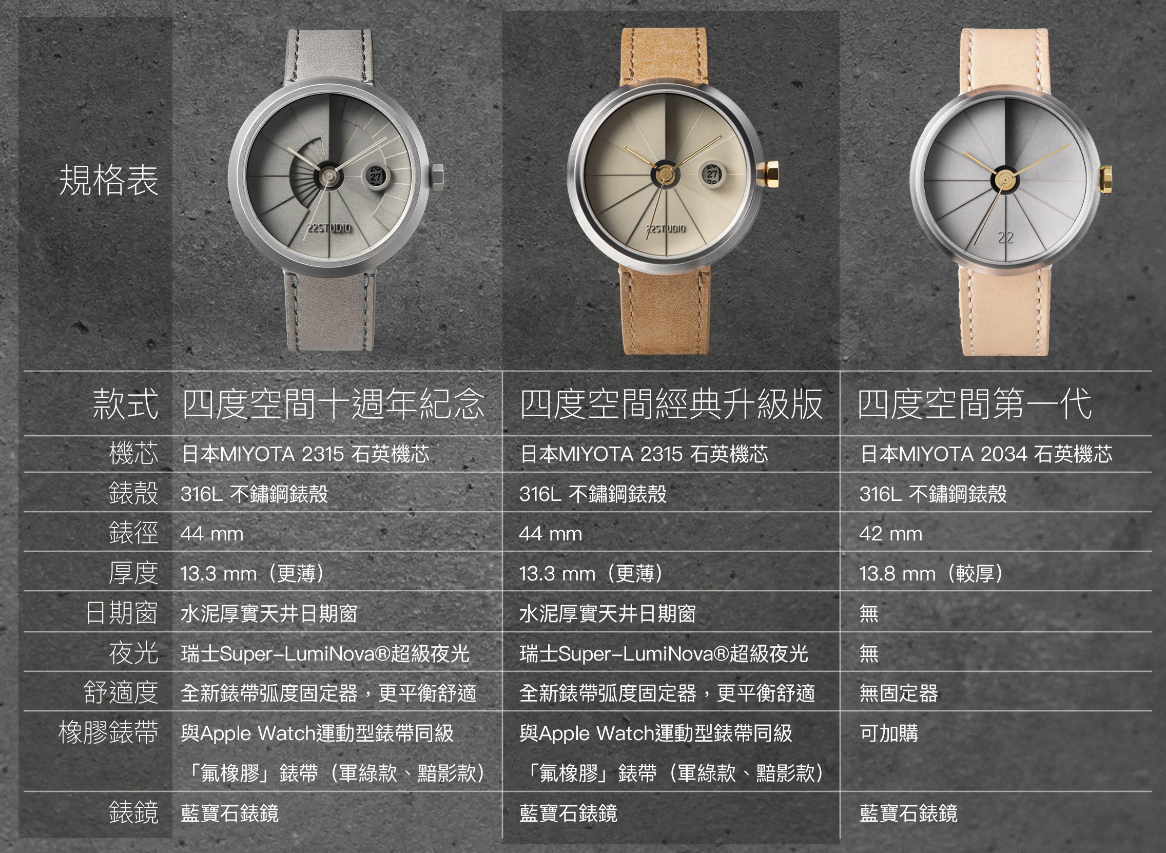 產品開發經歷了機械款、分格錶、上下坡、運動款等這幾年的鍛鍊。對產品永遠有更高的期待,每個系列都有一份新的創意、改良。如今,一路的累積也是時候回饋給陪我們征戰十年的四度空間水泥錶了!