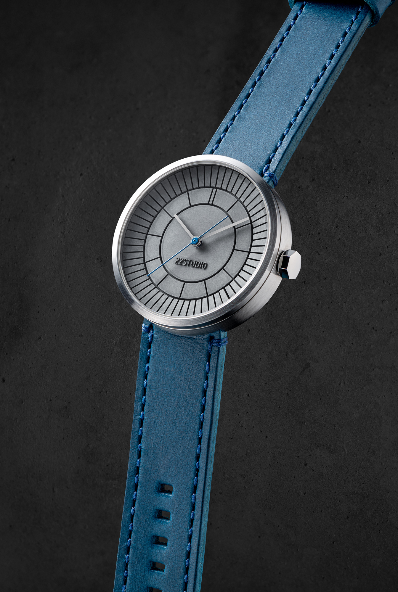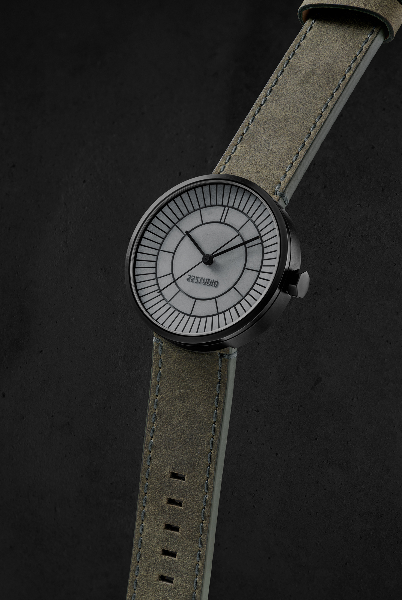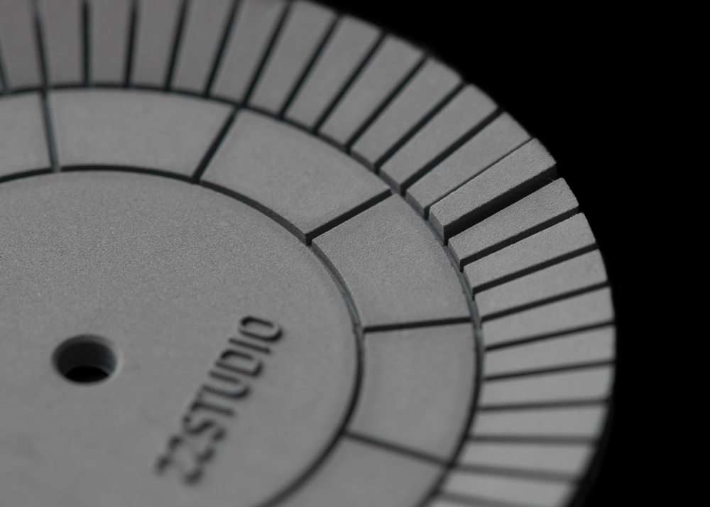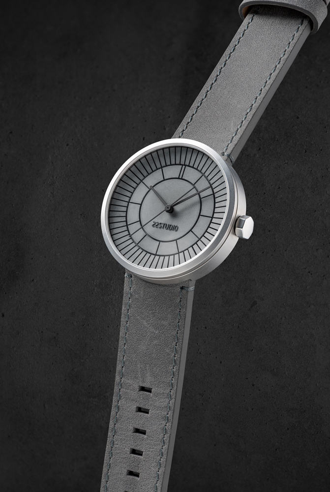 立體凹槽切割出放射狀 12 與 60 等分,用切割造成的陰影作為時標,精準指示每一分一秒。 第22分鐘的水泥格微微高起,呼應22品牌名稱,且配戴者才知道的幽微默契。