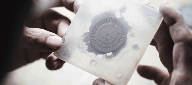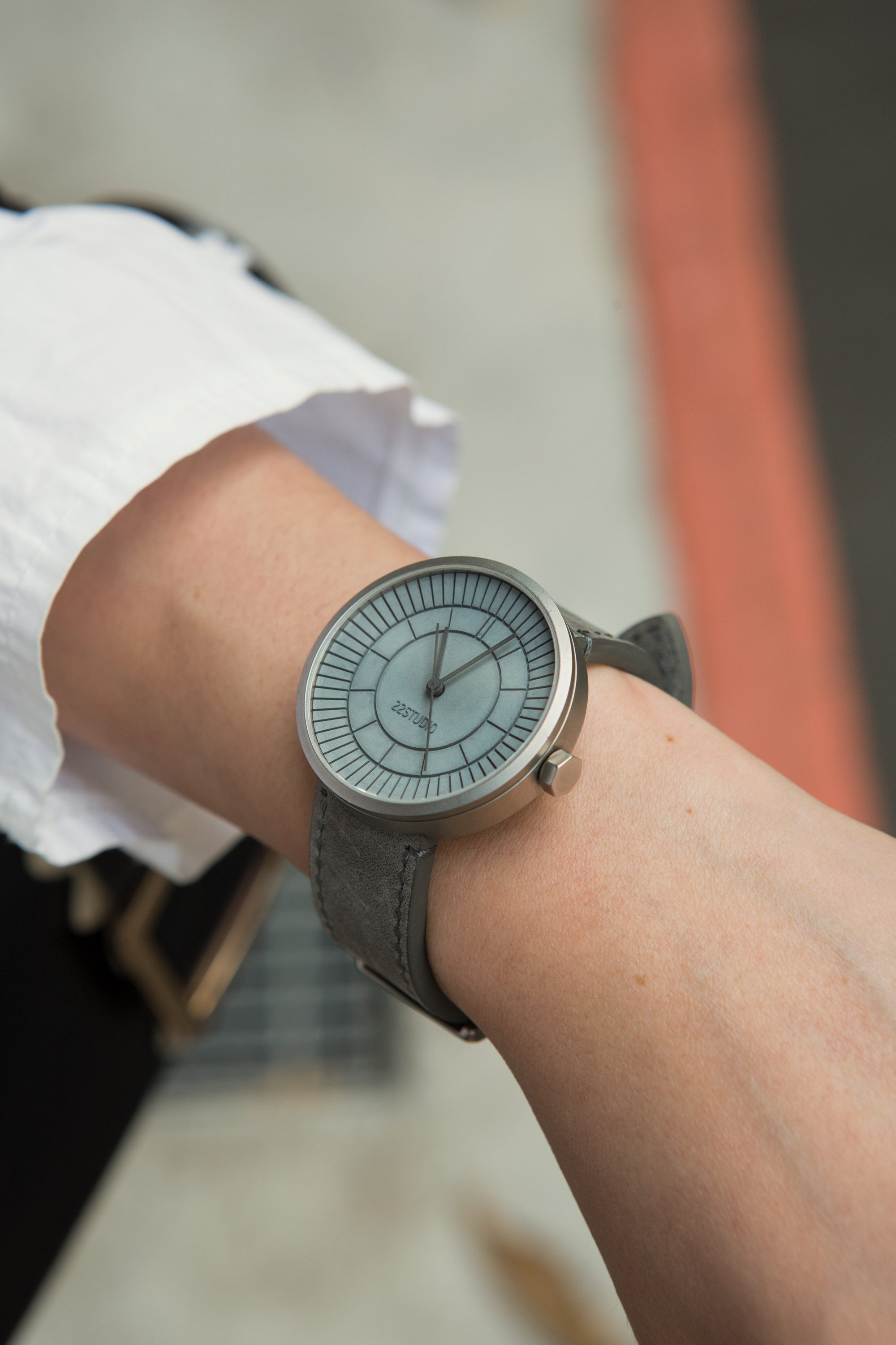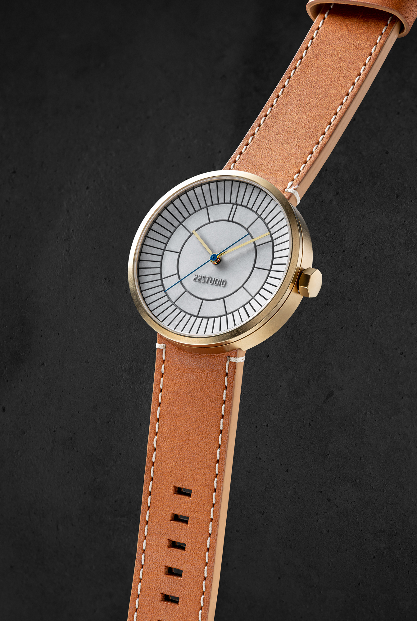 立體凹槽切割出放射狀 12 與 60 等分,用切割造成的陰影作為時標,精準指示每一分一秒。 第22分鐘的水泥格微微高起,呼應22品牌名稱,且配戴者才知道的幽微默契。