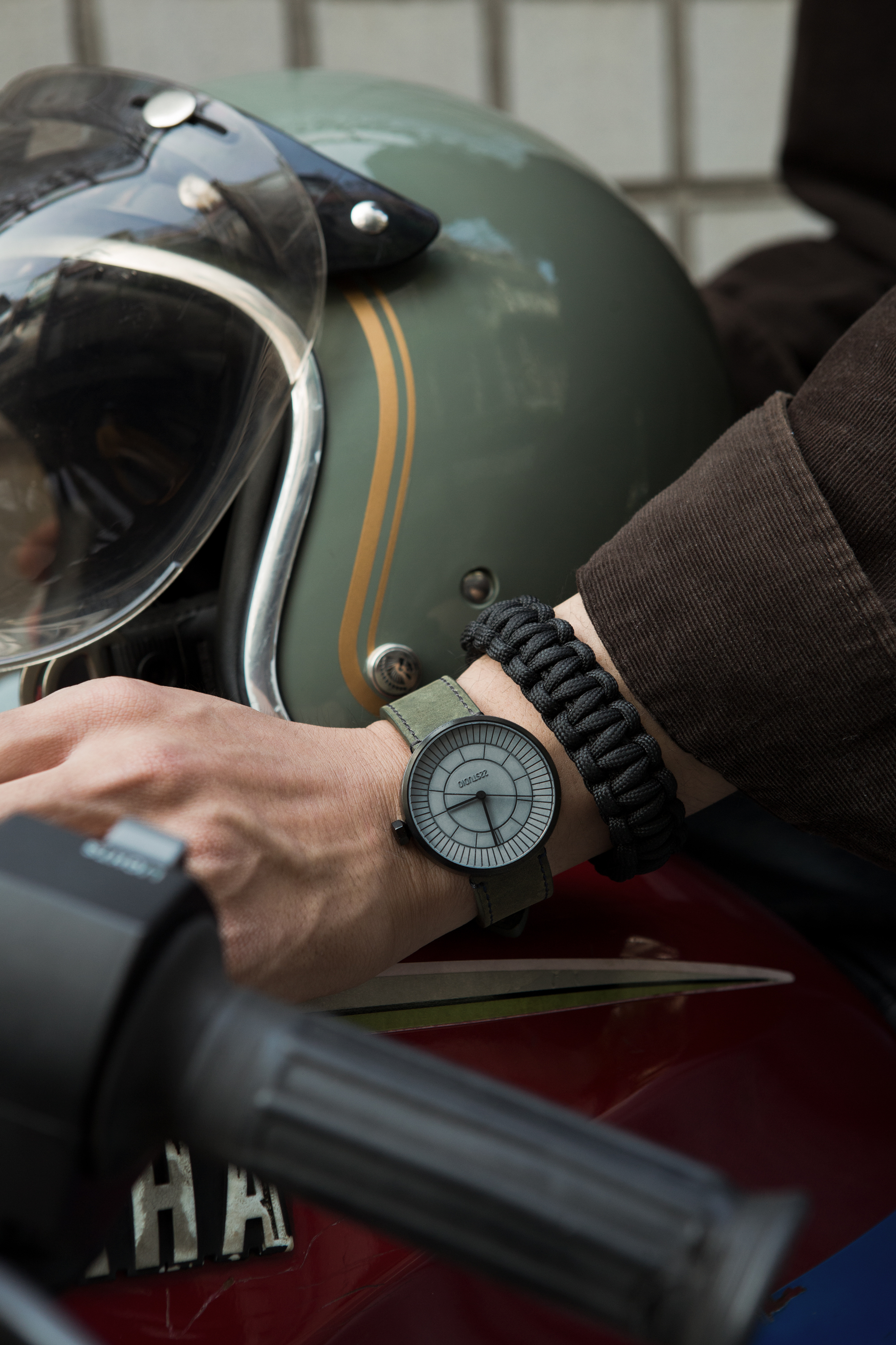 使用霧面黑色 PVD 處理的不鏽鋼錶殼、橄欖綠瘋馬皮革錶帶,搭配霧黑色指針以及灰色熟成水泥錶盤,整體呈現出都會人生中經歷滄桑的帥勁氛圍。