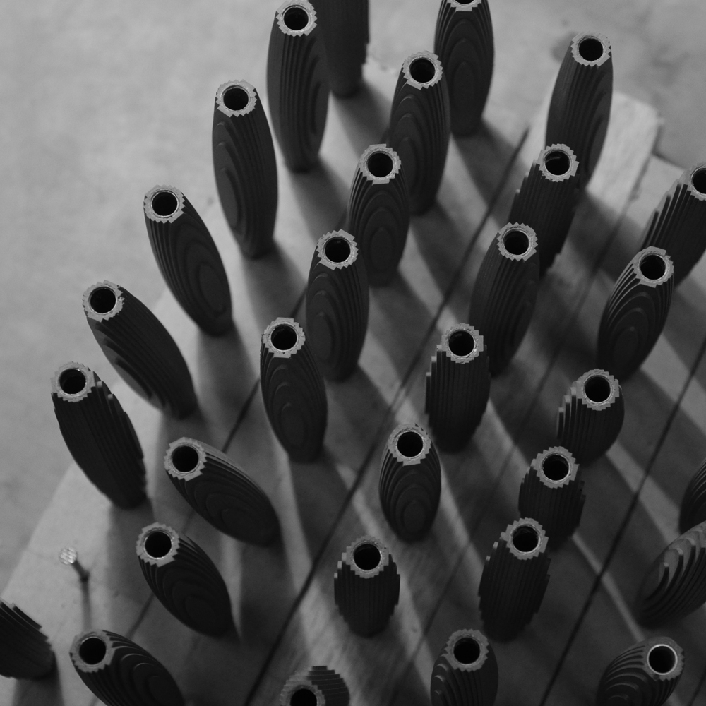 建築上,原本就有以幾何平面營造曲面的傳統與工法,此筆款帶有曲面的「梭型」(紡錘型),概念也源自於此。同時一片一片模板接合處,在使用時間拉長以後,會呈現水泥的自然使用痕跡,色澤更深、手感更潤滑。