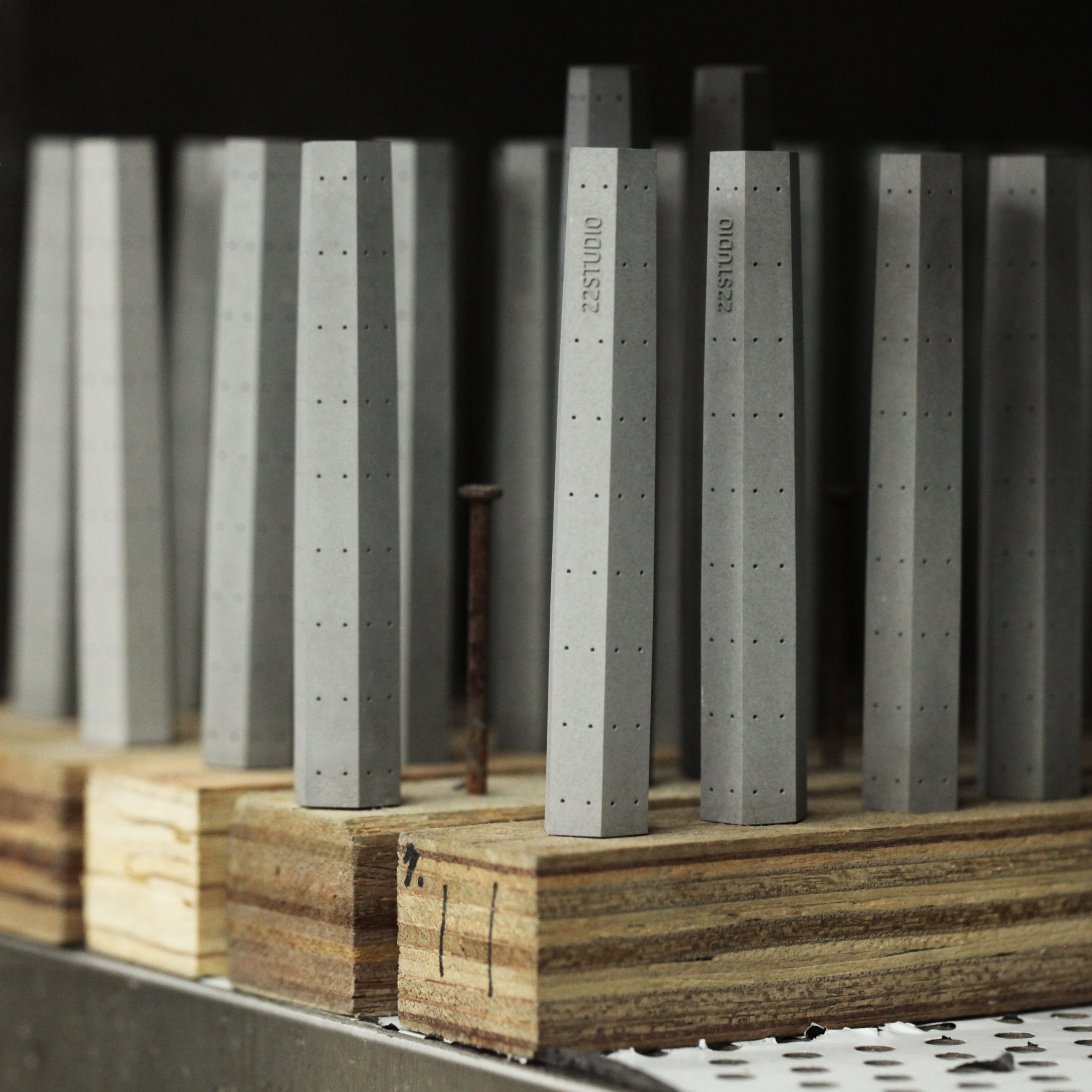 22STUDIO用清水模的工法細細打造隨身精品,從筆、文具、腕錶、桌鐘等物件本身就是一座可握在手中、配戴腕上、立於桌上的微型清水模建築。
