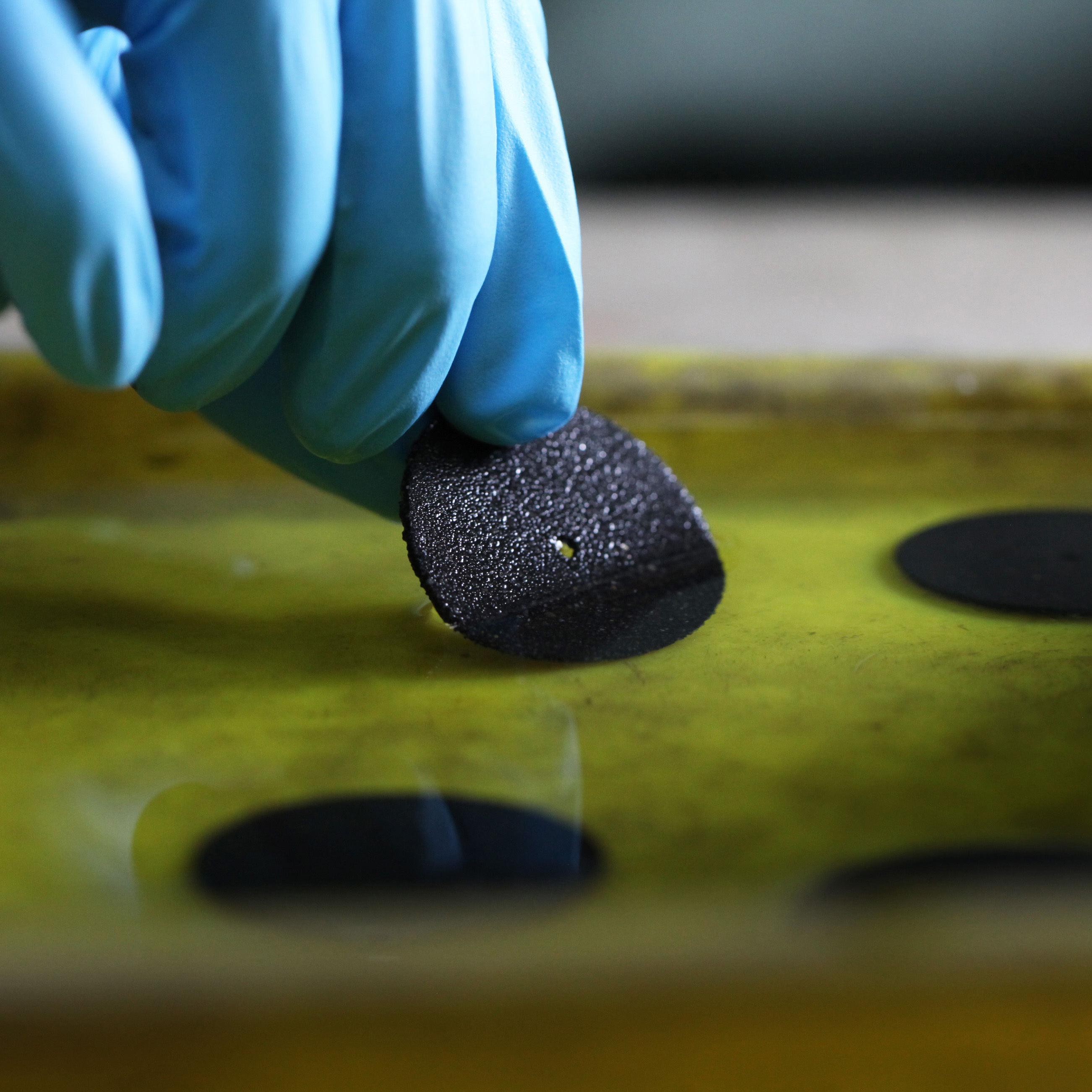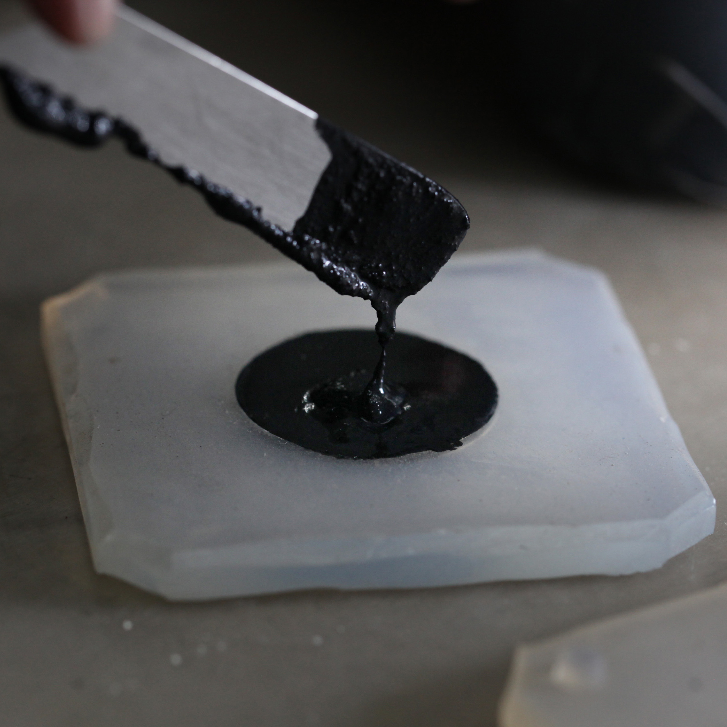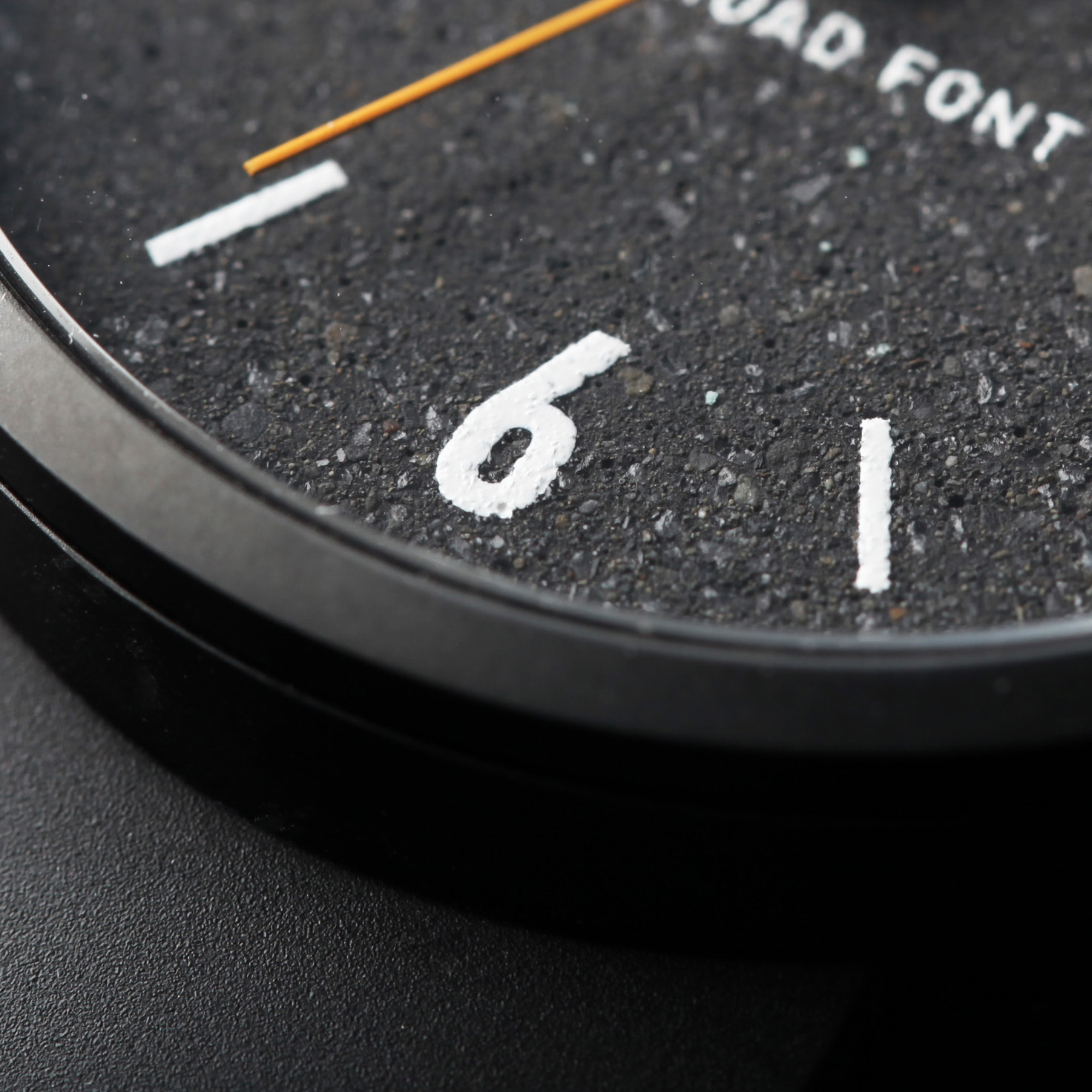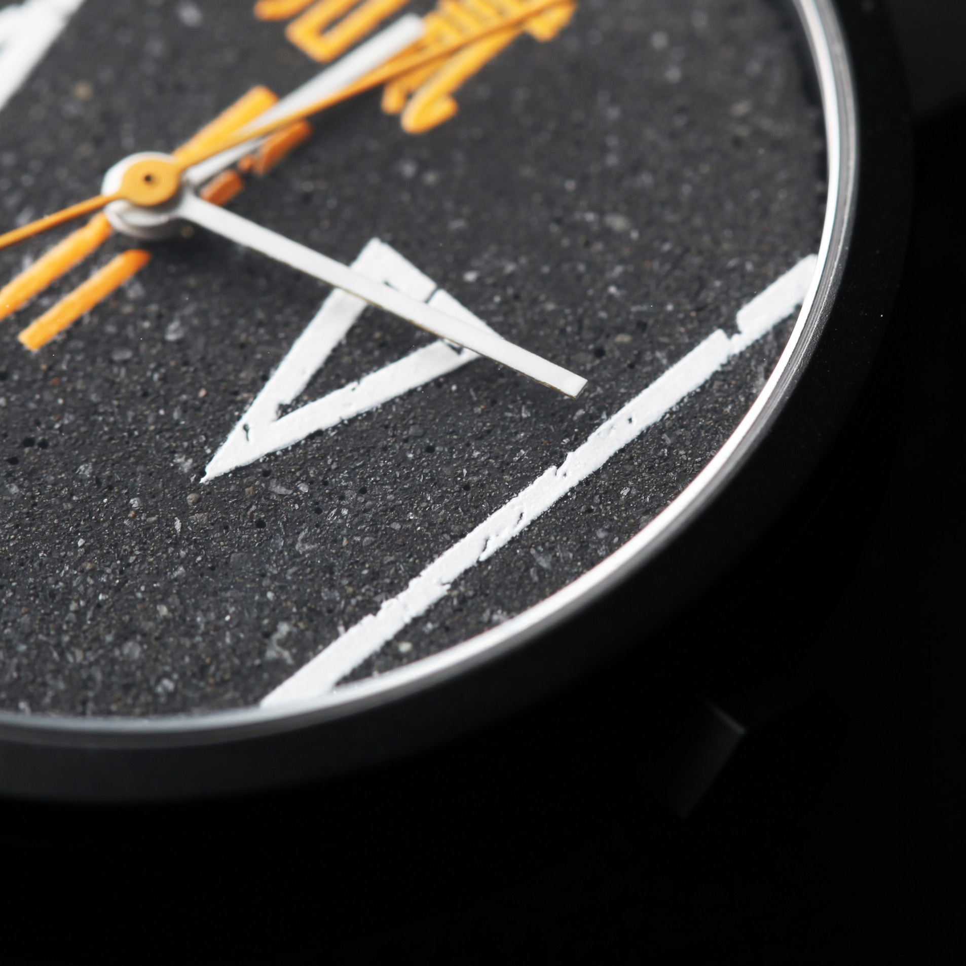 錶盤上,要呈現柏油馬路的質感。獨別研發「滄桑水泥」配方,高密度熟成水泥加酸洗工法,造就出歷經滄桑的表面質地。同時我們特地將水泥顏色加黑,調整了粉料中石英砂的粒徑與數量,以達到「微顆粒起伏」 類似柏油路的最佳效果。