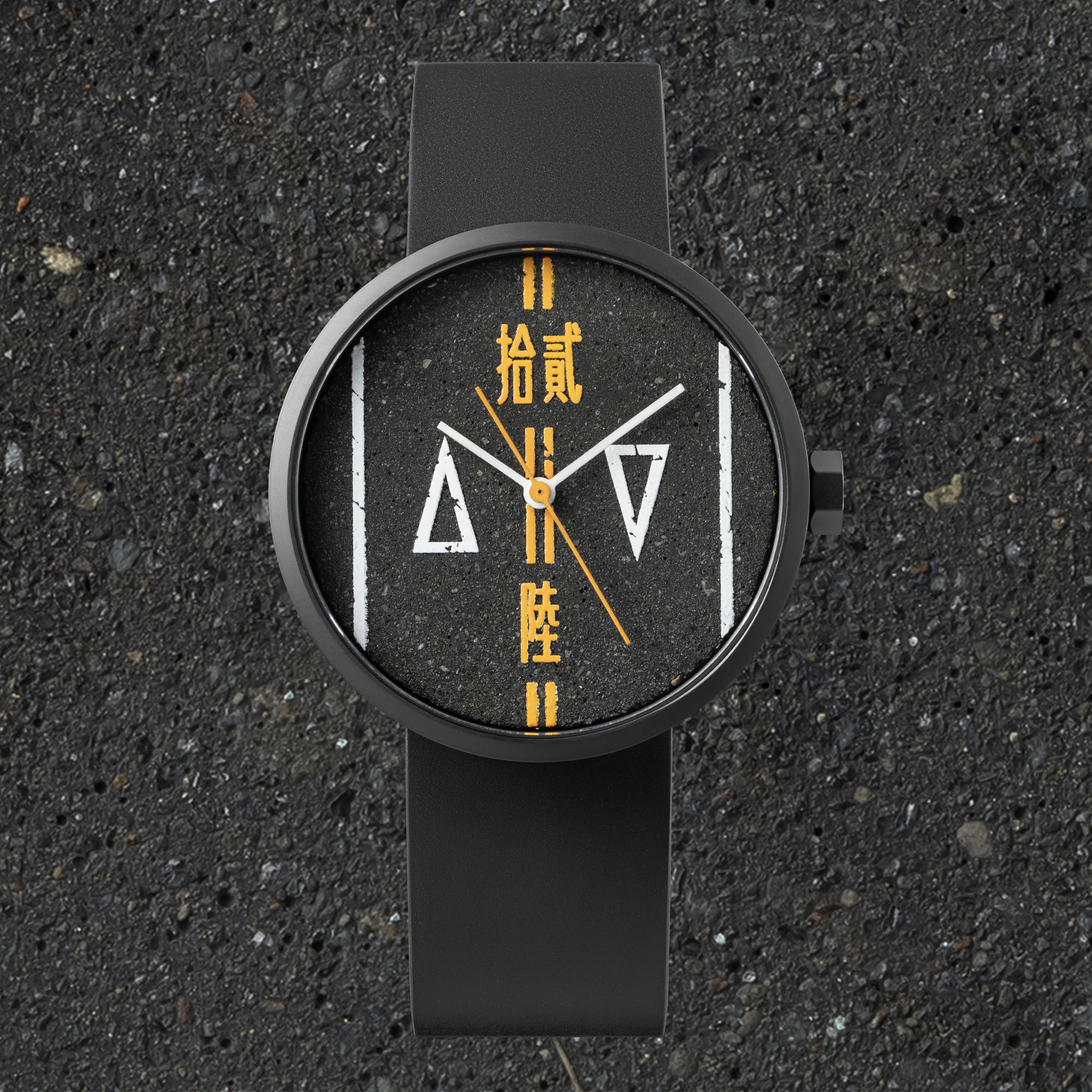 直接用上繁體中文「拾貳」與「陸」,巧妙融入馬路雙黃線,左右放上雙向道的標誌。有趣的把錶盤化身為日常生活中的馬路。
