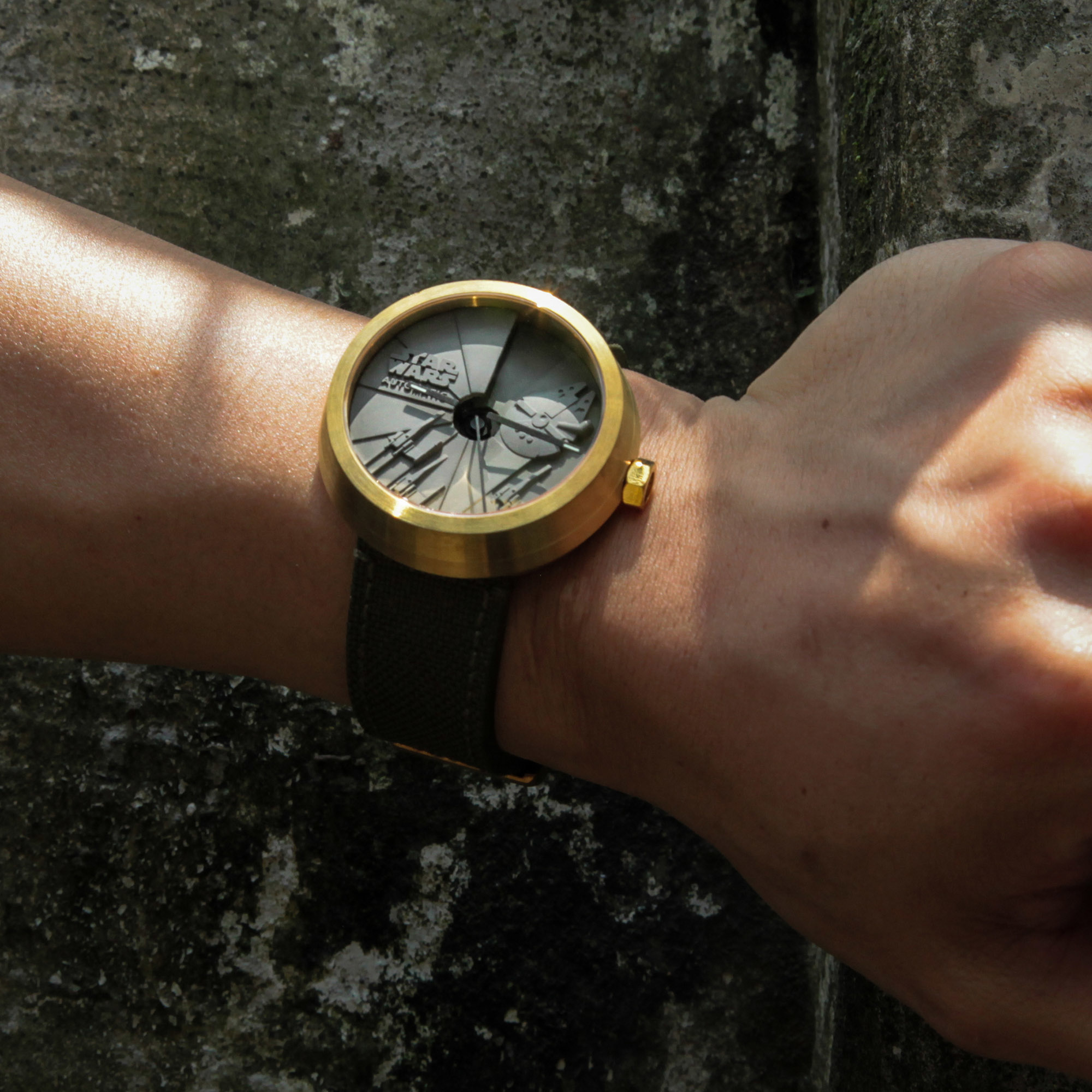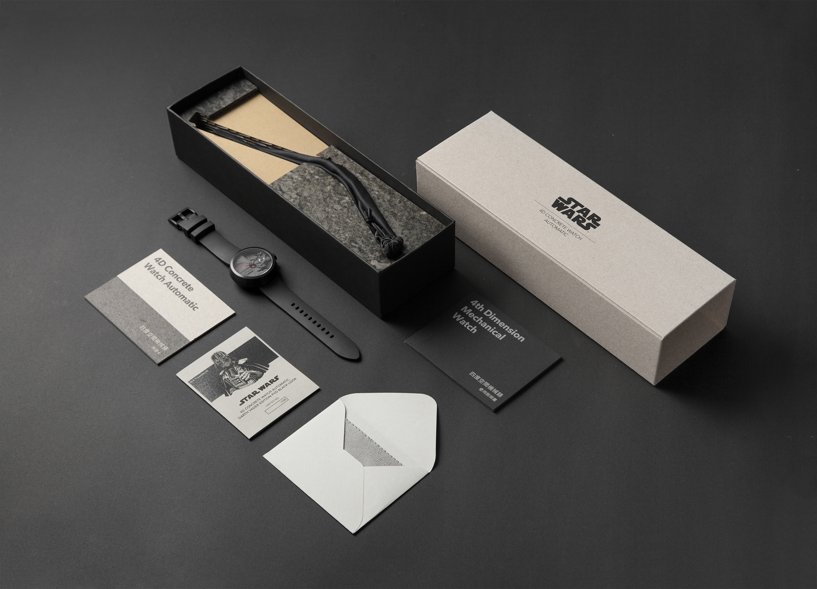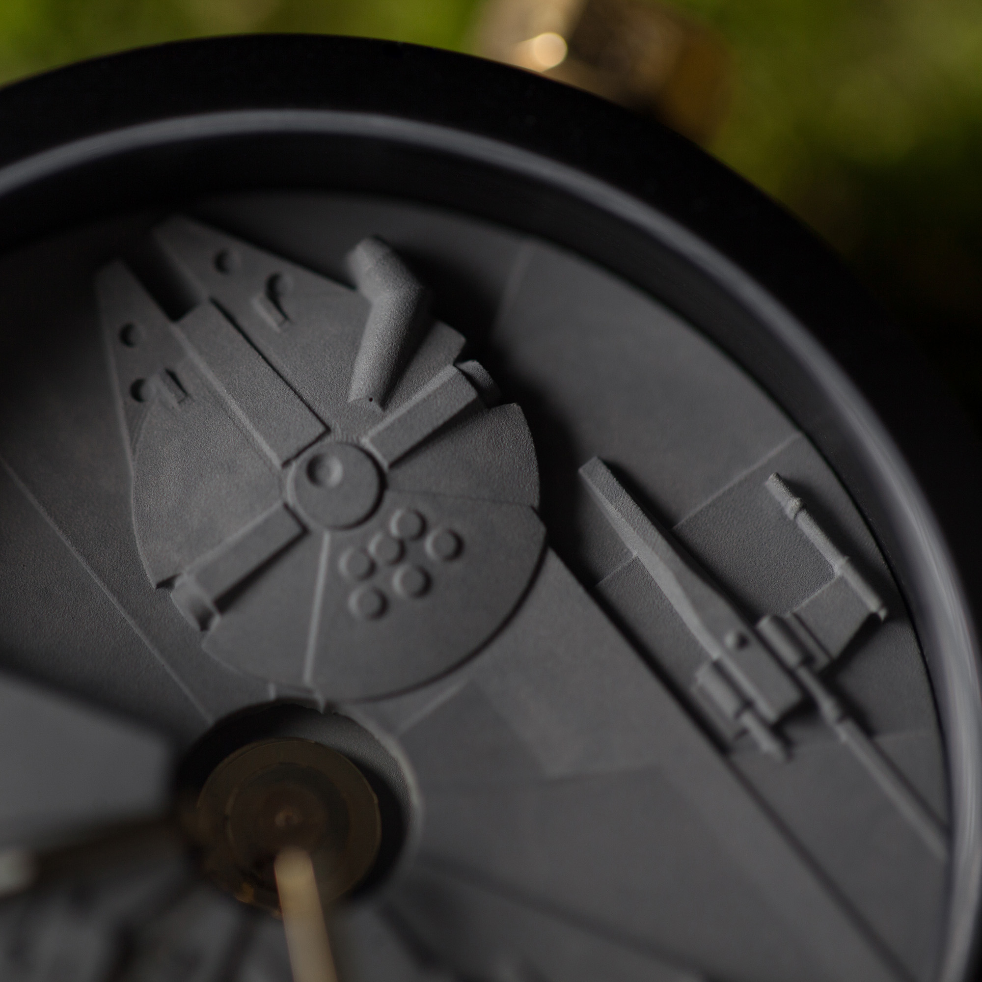 經典的水泥錶盤以非常戲劇化的方式,呈現黑武士駕駛專屬鈦戰機飛出死星二代的場景,將品牌最具代表性的旋轉樓梯概念結合死星二代,創造出造型繁複、充滿立體感、同時體現水泥極致工藝的錶盤設計。