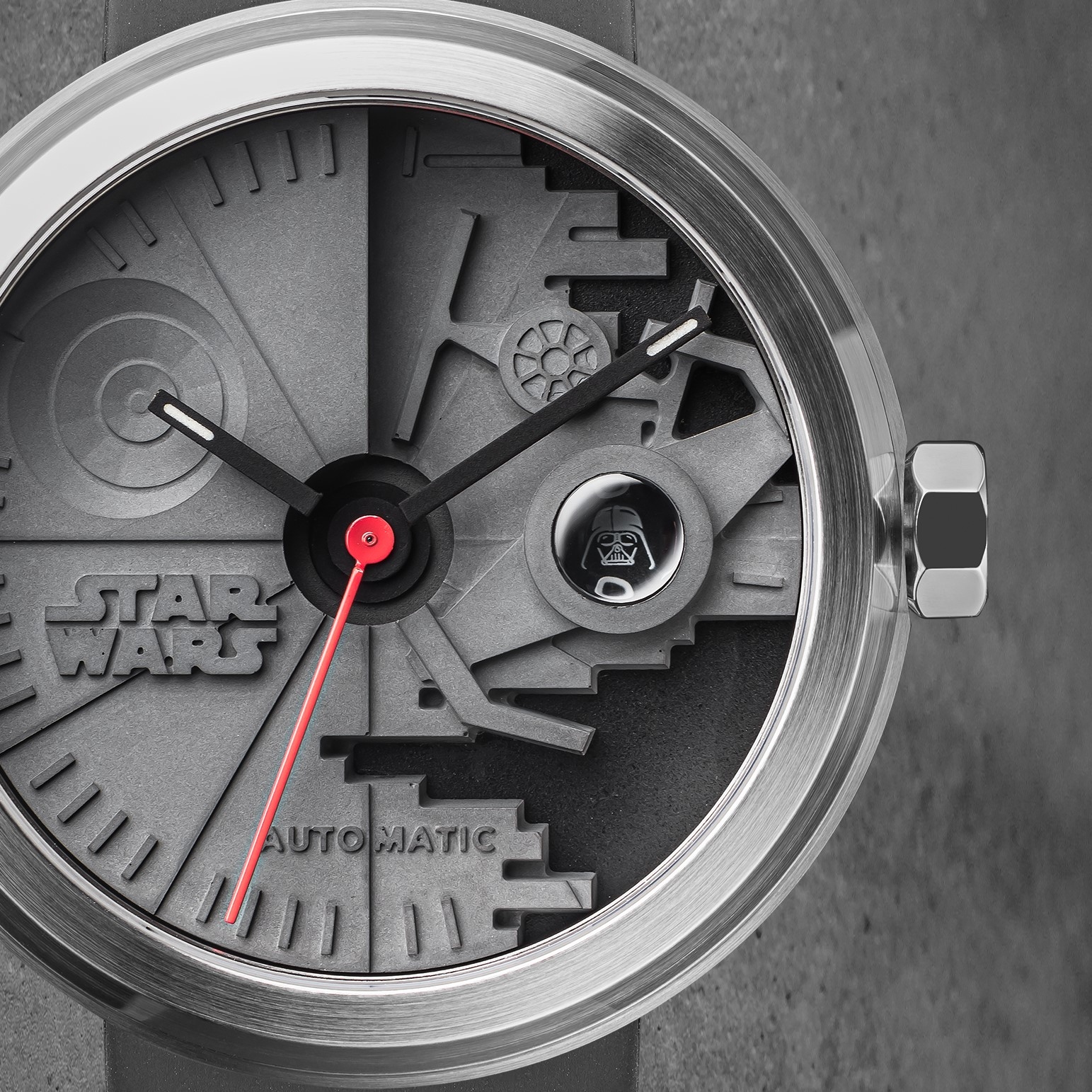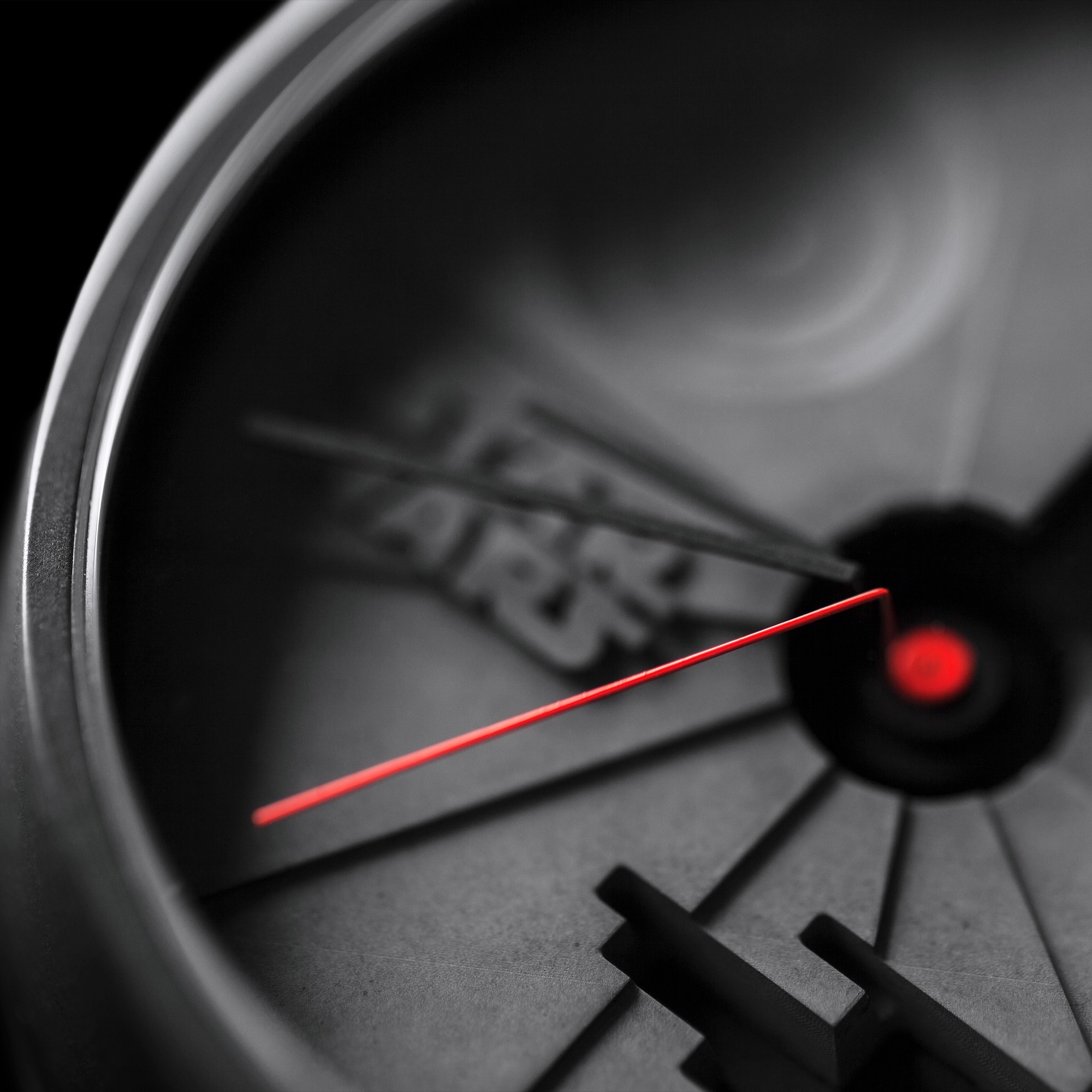 錶盤三點鐘方向的日期窗造型設計為黑武士的專屬鈦戰機,並將日期盤的4日改為黑武士頭像,呼應每年5月4日星戰日(May the Fourth)。