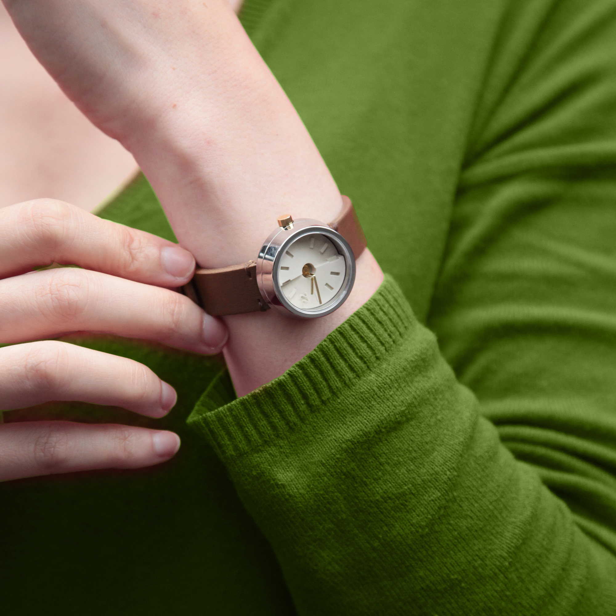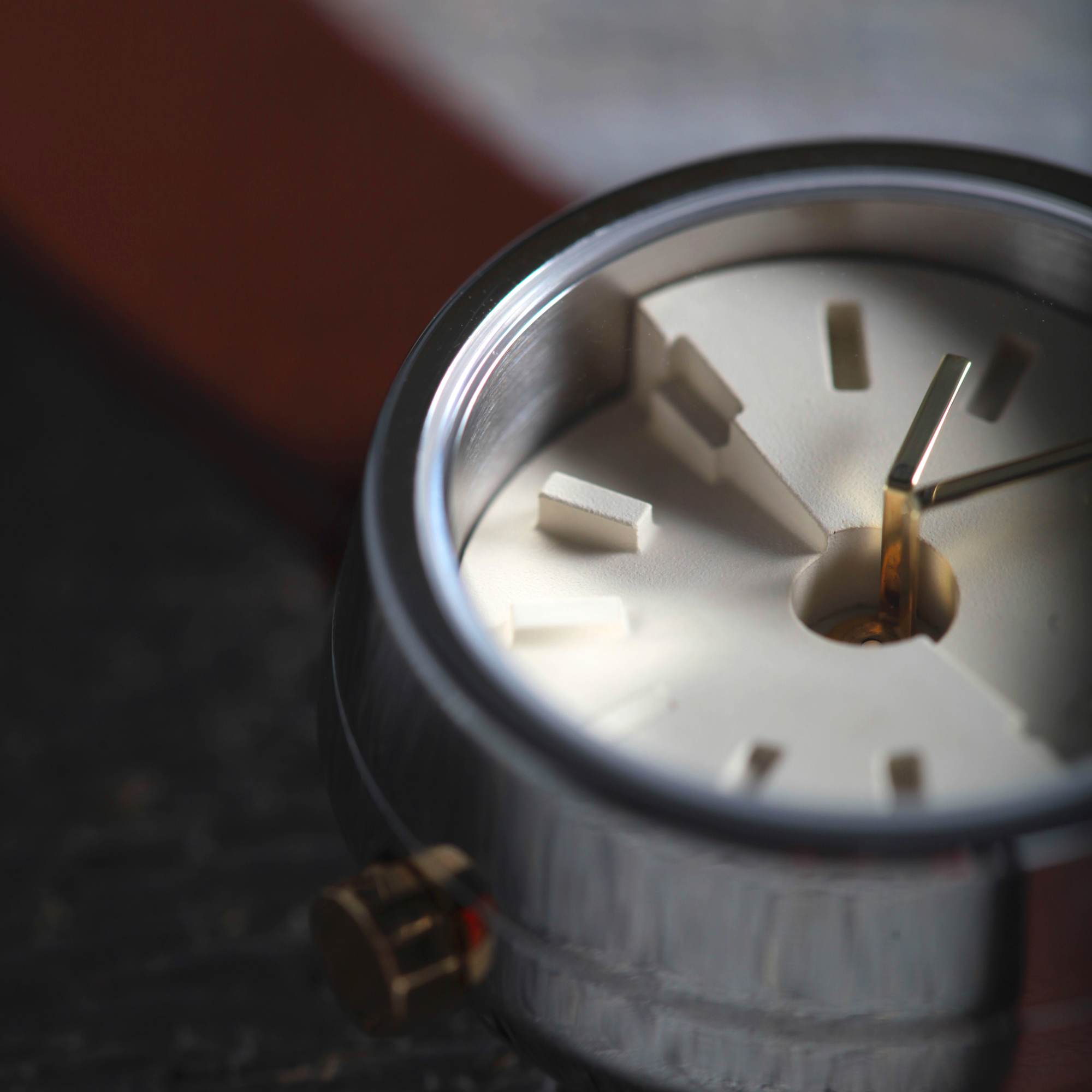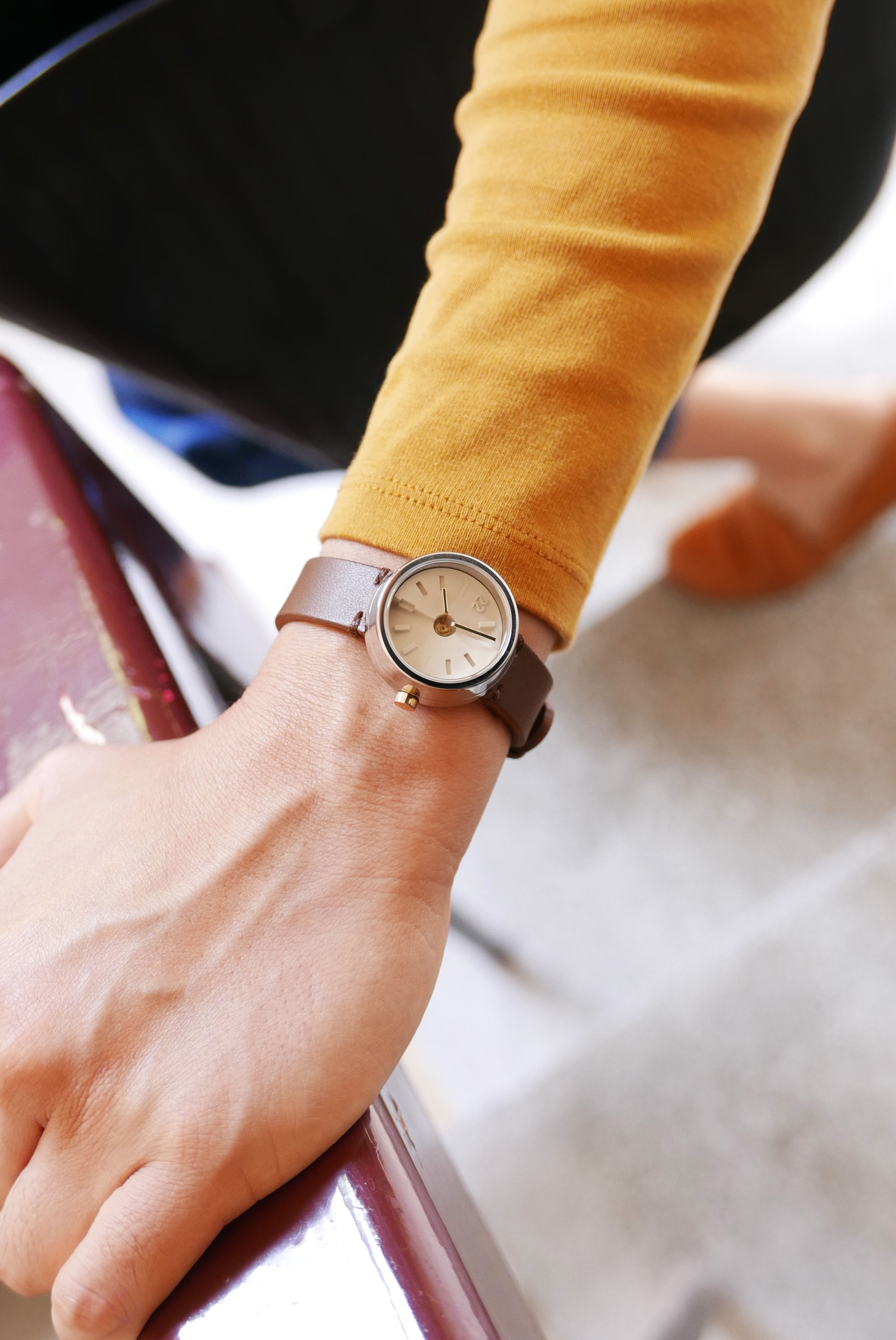 微醺款是這次最有個性的配色,米白色水泥錶盤與黑色指針,清楚鮮明的指示時間,毛絲面不鏽鋼錶殼呈現不鏽鋼堅固強韌的特色,搭配搶眼的酒紅色植鞣革錶帶。意外的是,特別襯托皮膚顯白,適合在意白皙度的妳。