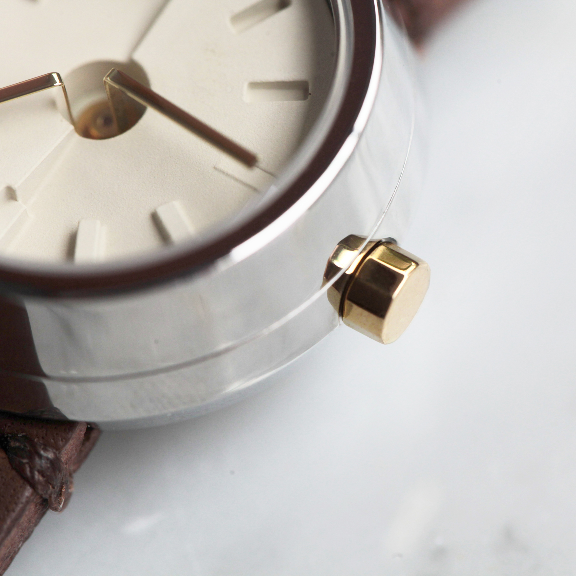 使用米白色水泥錶盤,搭配拋光面不鏽鋼錶殼、裸露黃銅錶冠與指針、與咖啡色植鞣皮革錶帶。經過一段時間後,時間會讓不鏽鋼出現些許細紋、黃銅微微氧化、錶帶多了點使用過後的光澤,整體散發出昭和時期的復古優雅氣氛。