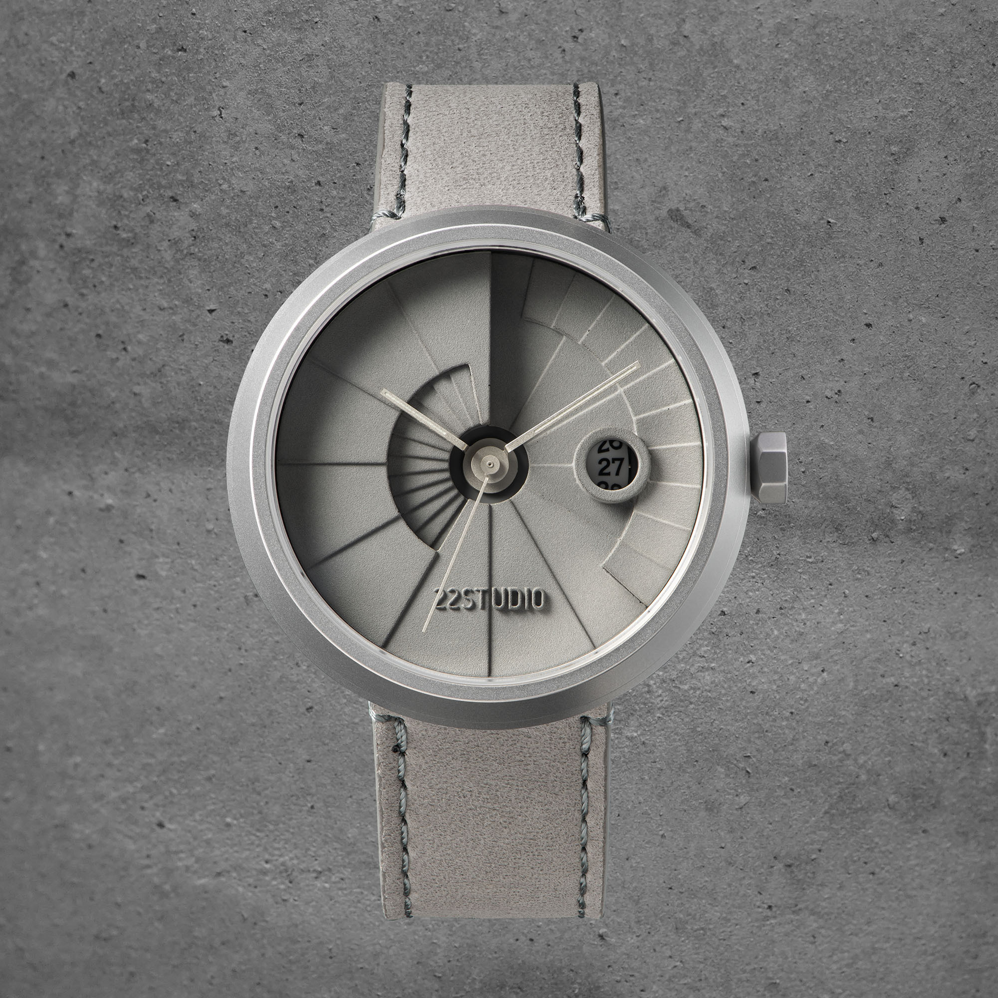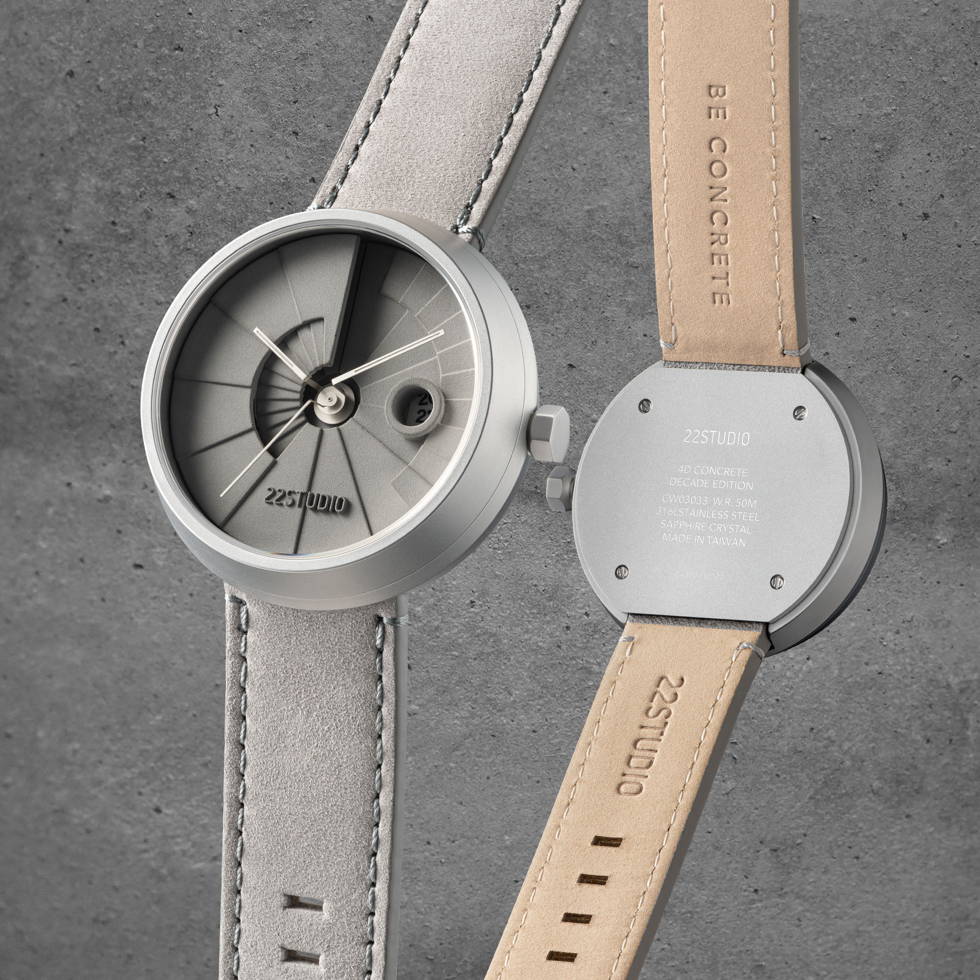 以22STUDIO獨家配方水泥灌製,經過14天養護後,手工修整毛邊。製作出結構堅固、紋理獨一無二的熟成水泥錶盤,最後以0.2mm的公差進行尺寸檢驗,以確保品質。