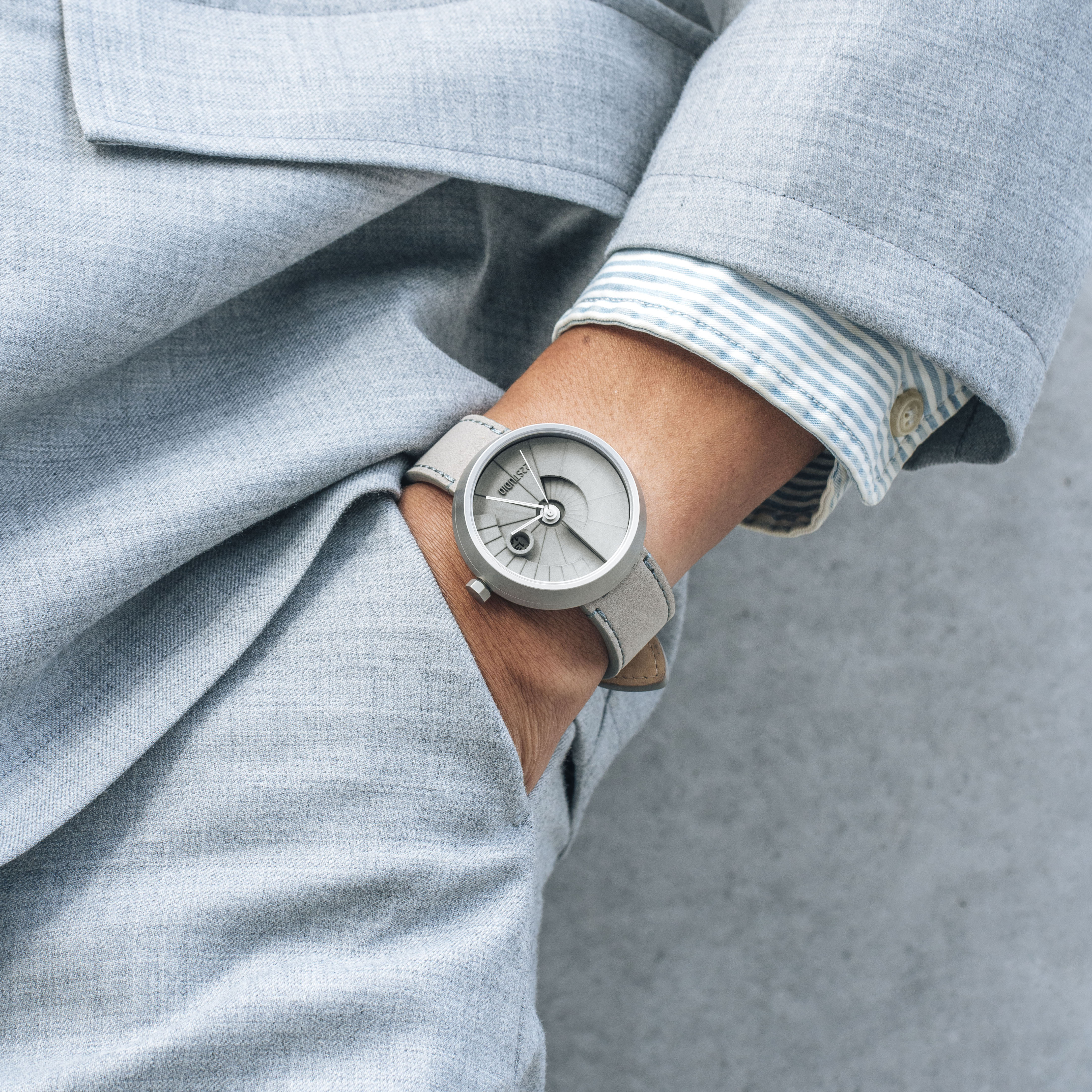 水泥感最高的標誌性配色,高密度水泥原色錶盤、霧面不銹鋼錶殼、搭配霧面灰指針、灰色義大利植鞣皮革。